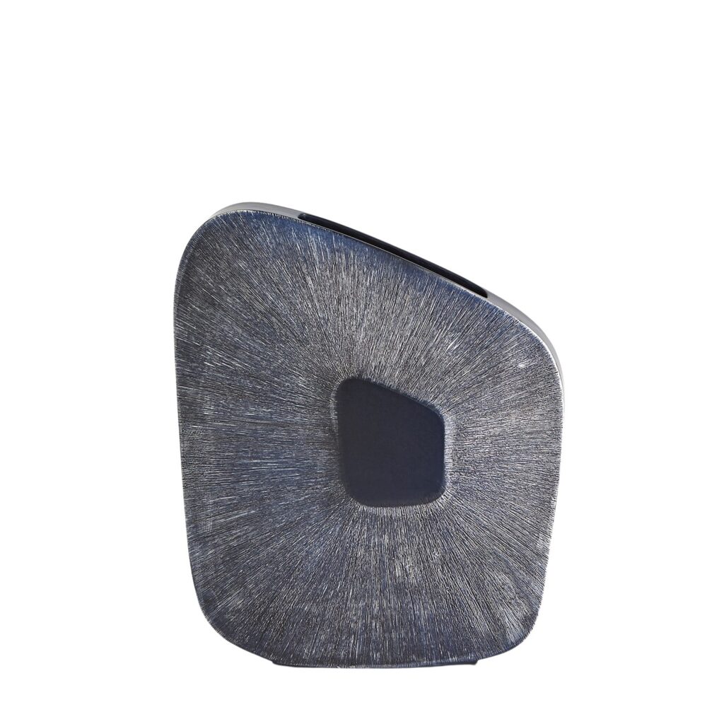 [0] => Crafted from blue Portuguese ceramic with an ink finish, the Offset Square Scratch Vase has an eye-catching striated design with narrow white lines radiating from a central blank space. This vase has a wide shape that can show off an equally daring bouquet or stand on its own as a funky accent piece for a modern interior.