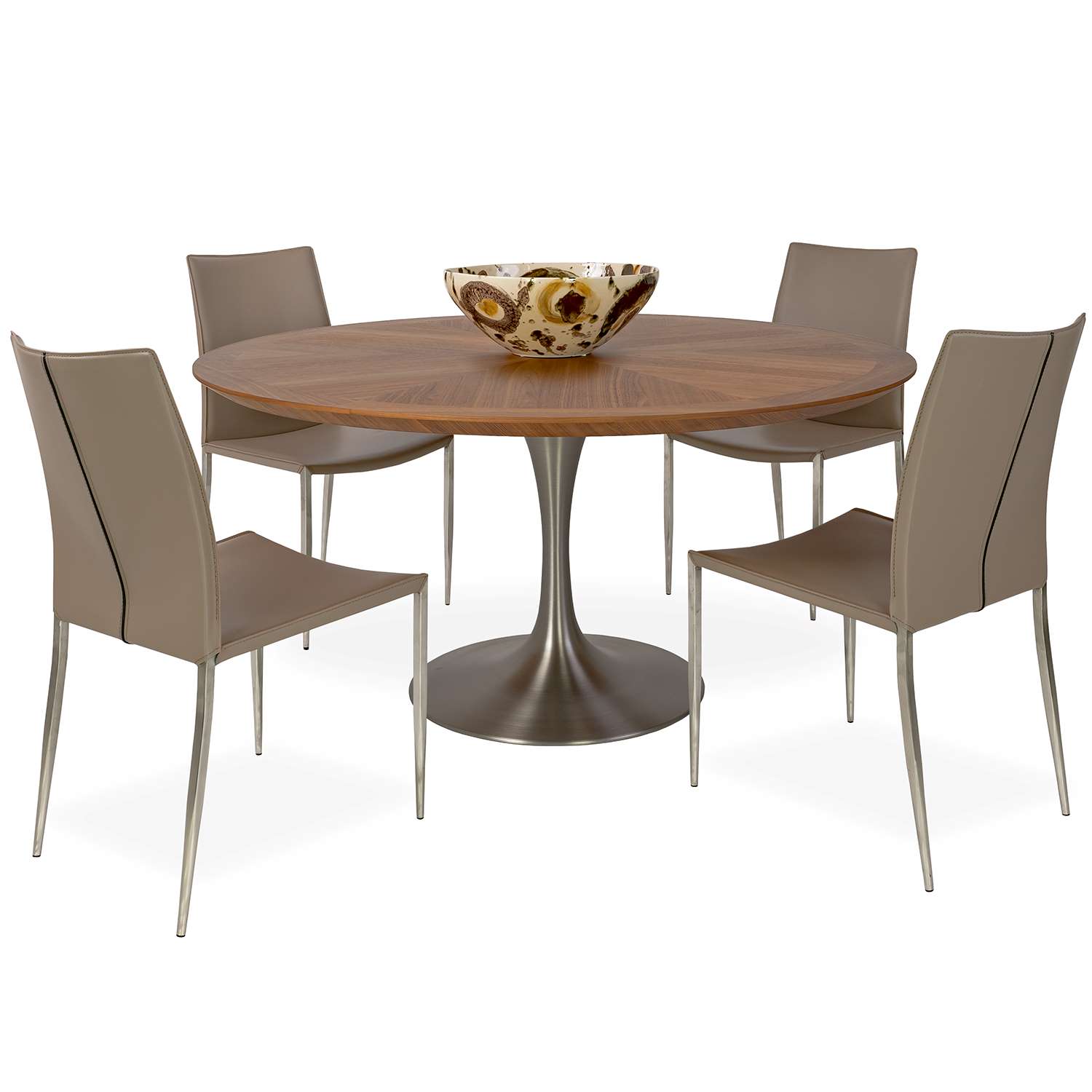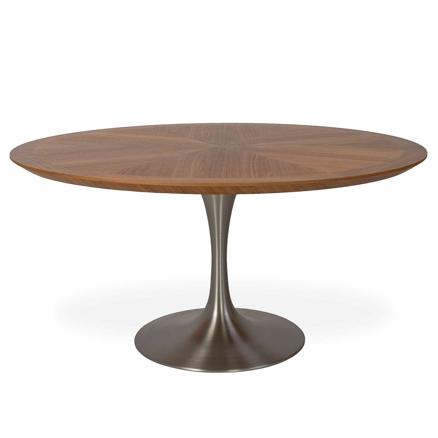 [0] => oliana dining table 59" round - walnut w/ brushed stainless steel base