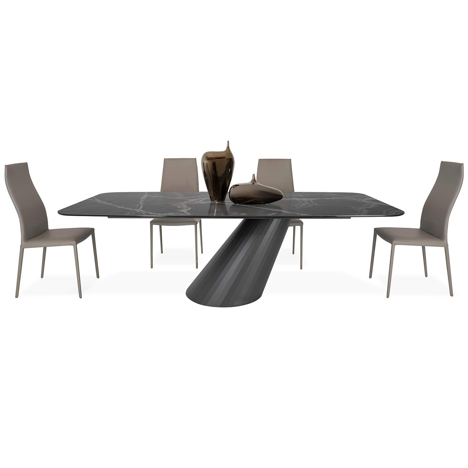 [0] => Fashion your dining space into a work of art with the Olimpia Dining Table. Statuesque and sophisticated, Olimpia has a rounded porcelain tabletop with a glossy, marble-look onyx finish in shades of grey, supported by an angled cantilever base in matte anthracite. Made in the Pesaro province of Italy with a blend of traditional and modern techniques, Olimpia is the embodiment of groundbreaking contemporary design.