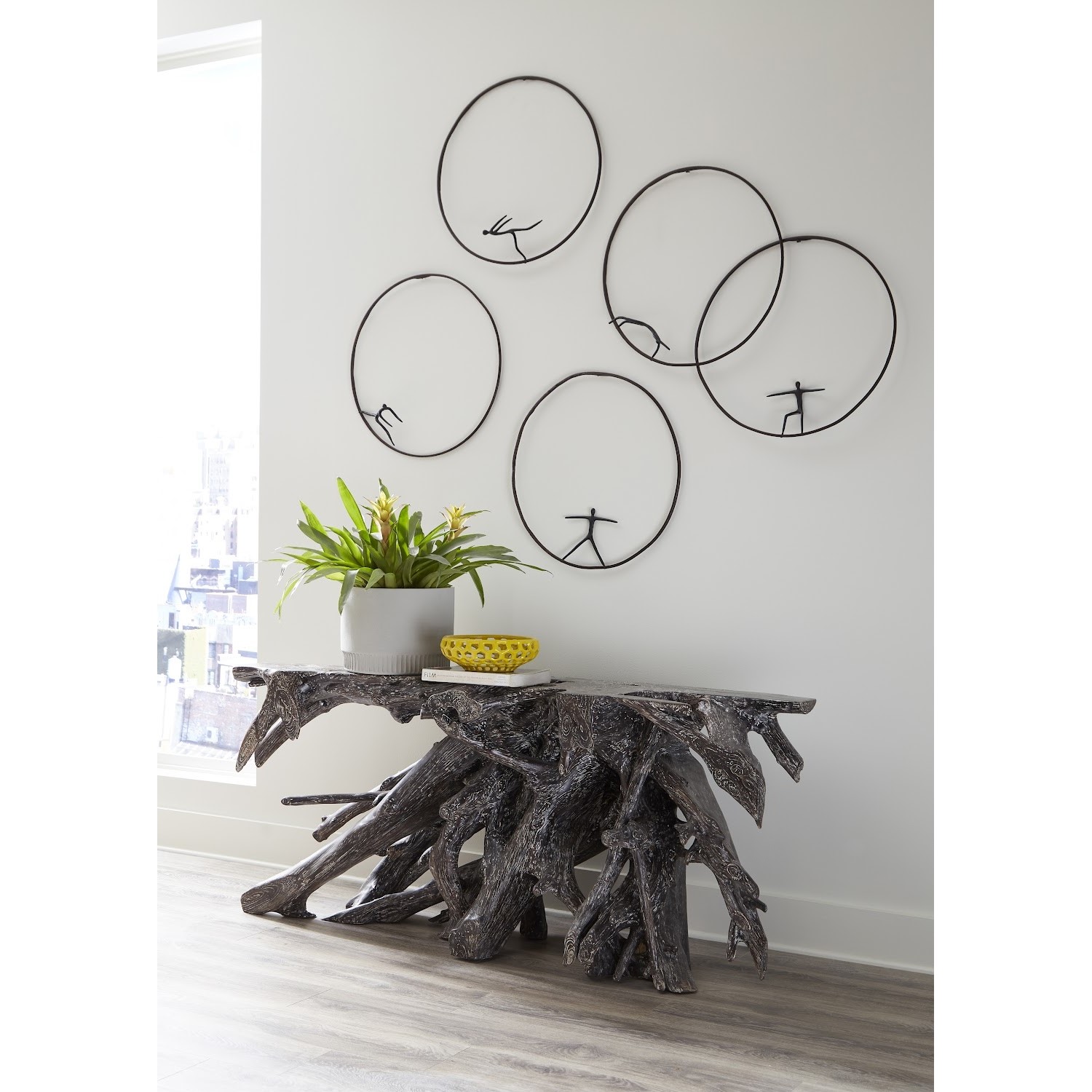 [0] => The Olympic Figurine combines a minimalist and modern look with a playful and athletic vibe. Wrought from iron with black and rust finishes, this sculpture depicts a small figure standing with their arms wide and legs slightly bent on the inside of a large hoop, creating an impression of agility and strength. Pair with other pieces in the Olympic Figurine collection to create an eye-catching arrangement that proclaims your love of sports.