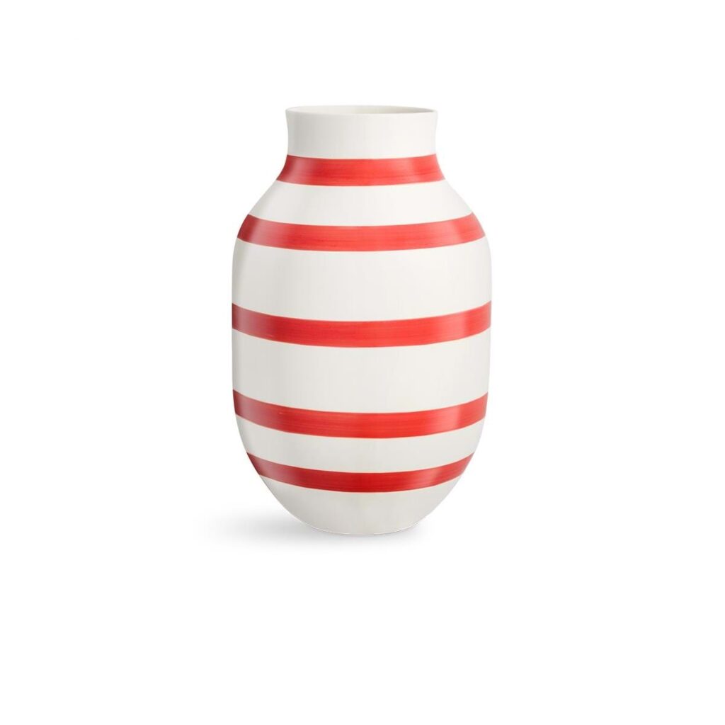 The Omaggio Large Ceramic Vase has a classic, elegant design, with a streamlined silhouette and hand-painted stripes in red that make each vase unique. Its minimalist design enables it to both stand on its own as an accent piece or serve as a vessel for fresh or artificial flowers, and it can be placed on any shelf, tabletop, or credenza to add timeless style to any room.