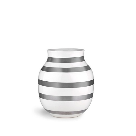[0] => The Omaggio Medium Ceramic Vase has a classic, elegant design, with a streamlined silhouette and hand-painted stripes in silver that make each vase unique. Its minimalist design enables it to both stand on its own as an accent piece or serve as a vessel for fresh or artificial flowers, and it can be placed on any shelf, tabletop, or credenza to add timeless style to any room.