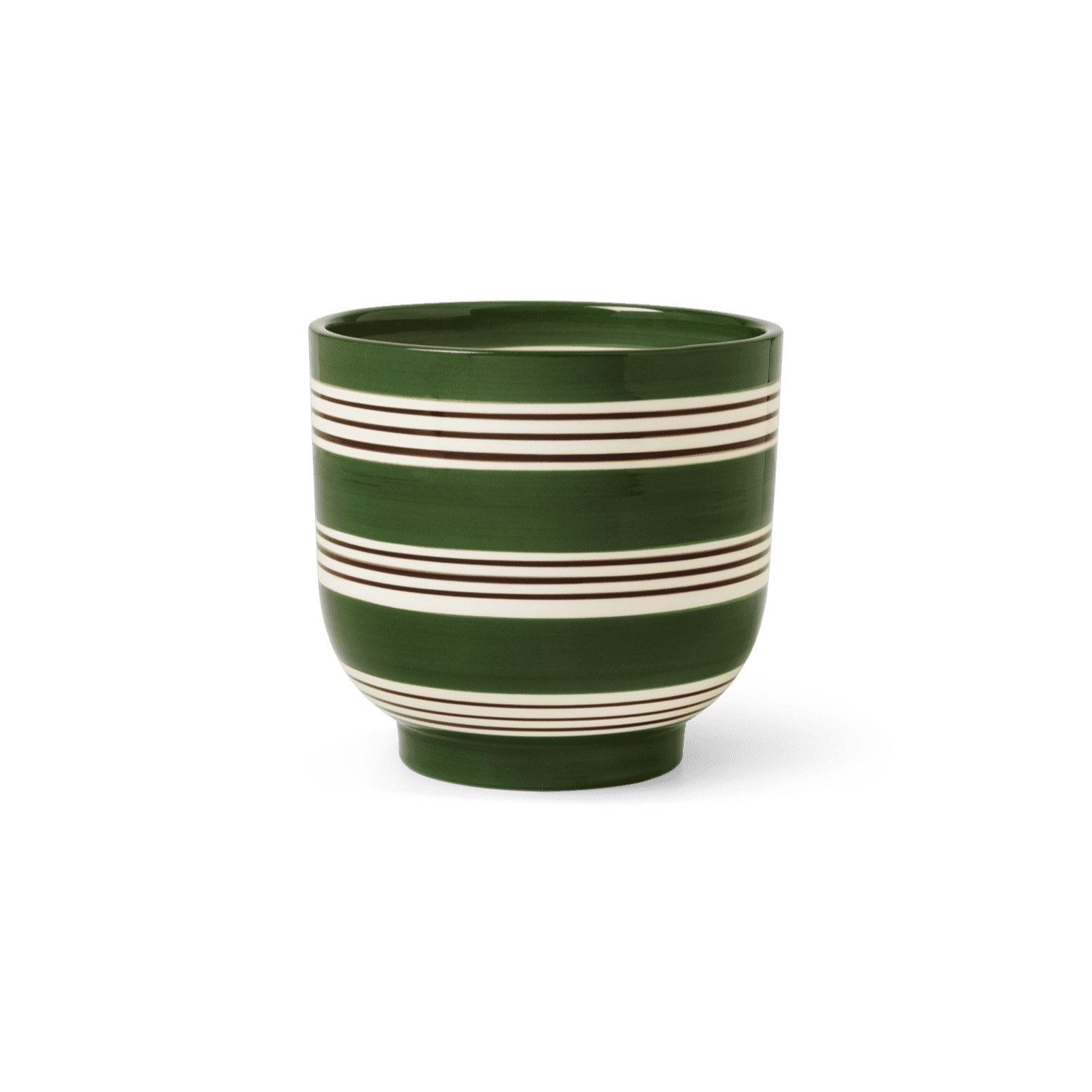 The Omaggio Nuovo Flowerpot in Green is a revival of the classic Omaggio series, with a reinterpreted design. This faience flowerpot sports a pleasing rounded shape with hand-painted stripes that alternate between dark green bands and white bands with a thinner brown stripe. Its minimalist design and compact size make it perfect for holding smaller plants, herbs, or succulents. Place the Omaggio Nuovo on any shelf, tabletop, or credenza to show off this new classic.