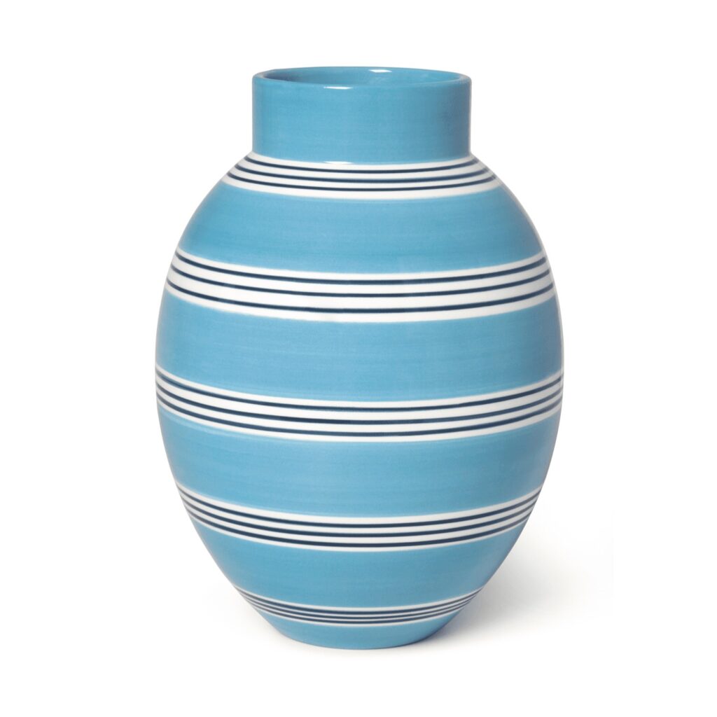 [0] => The Omaggio Nuovo Vase in Blue is a revival of the classic Omaggio series, with a reinterpreted design. This faience vase sports a pleasing rounded shape with hand-painted stripes that alternate between light blue bands and white bands with thinner stripes in dark blue. Its minimalist design enables it to display flowers or stand on its own as an accent piece. Place the Omaggio Nuovo on any shelf, tabletop, or credenza to show off this new classic.