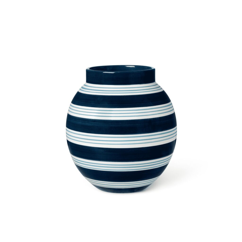 [0] => The Omaggio Nuovo Vase in Dark Blue is a revival of the classic Omaggio series, with a reinterpreted design. This faience vase sports a pleasing rounded shape with hand-painted stripes that alternate between dark blue bands and white bands with thinner stripes in light blue. Its minimalist design enables it to display flowers or stand on its own as an accent piece. Place the Omaggio Nuovo on any shelf, tabletop, or credenza to show off this new classic.