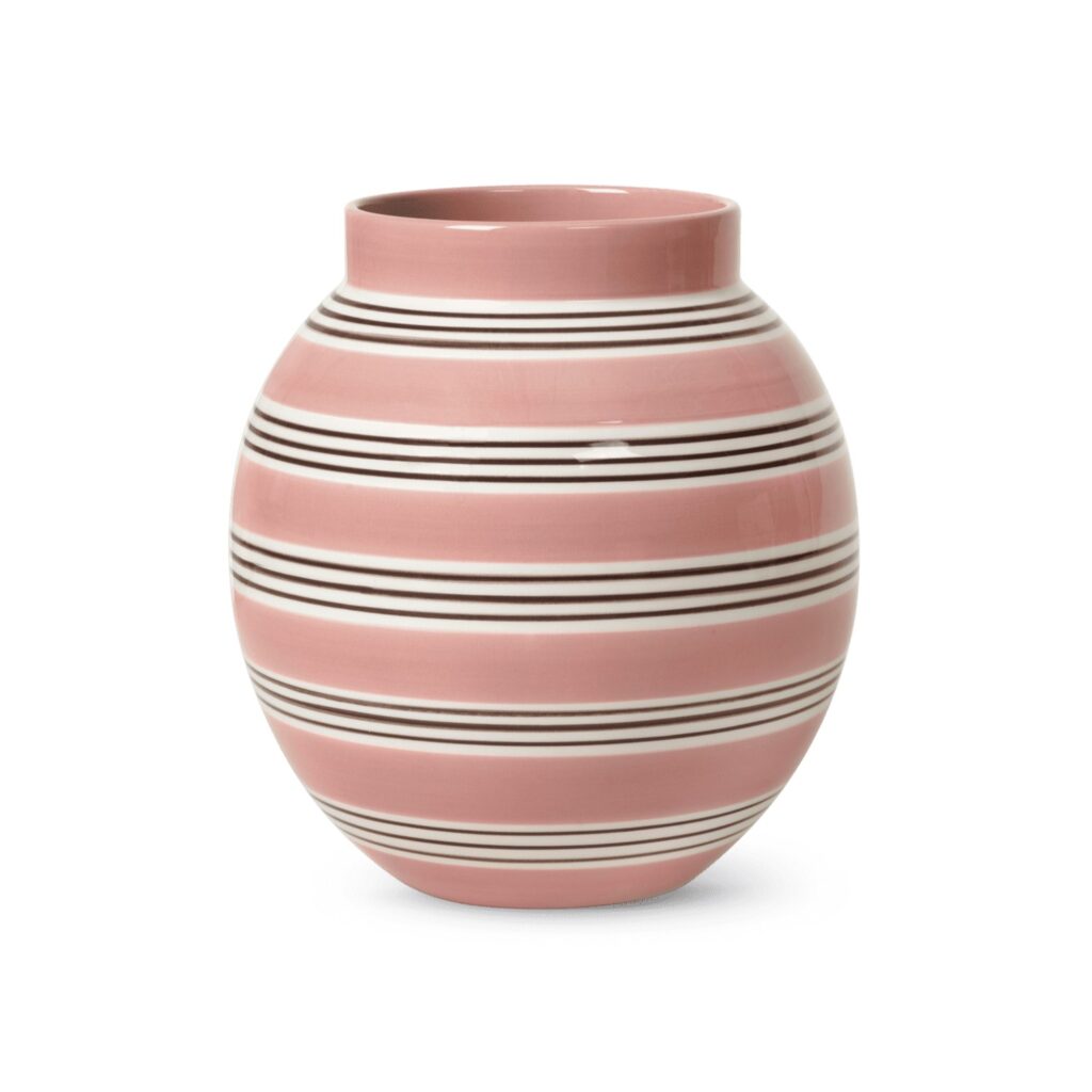 [0] => The Omaggio Nuovo Vase in Dusty Pink is a revival of the classic Omaggio series, with a reinterpreted design. This faience vase sports a pleasing rounded shape with hand-painted stripes that alternate between dusty pink bands and white bands with thinner brown stripes. Its minimalist design enables it to display flowers or stand on its own as an accent piece. Place the Omaggio Nuovo on any shelf, tabletop, or credenza to show off this new classic.