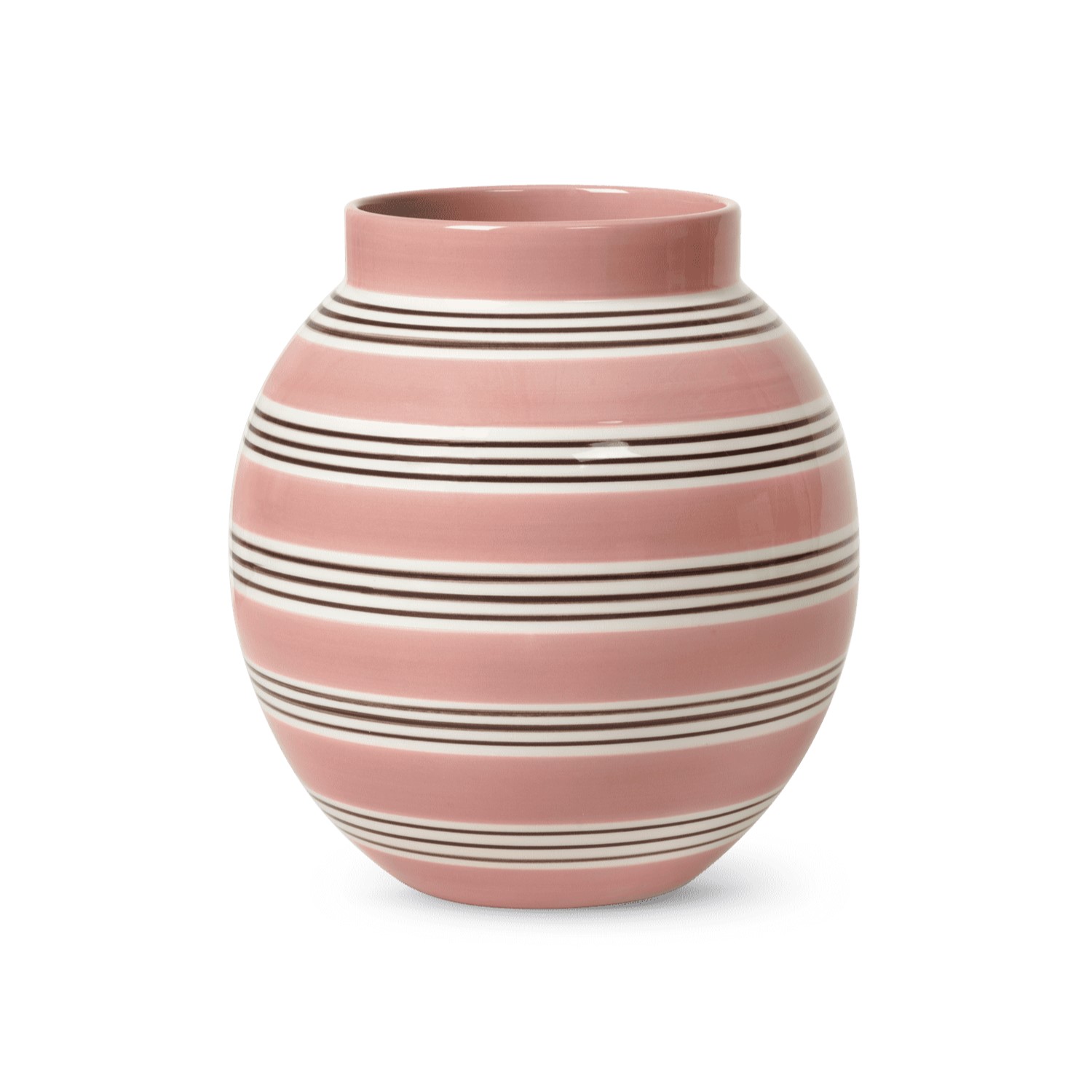The Omaggio Nuovo Vase in Dusty Pink is a revival of the classic Omaggio series, with a reinterpreted design. This faience vase sports a pleasing rounded shape with hand-painted stripes that alternate between dusty pink bands and white bands with thinner brown stripes. Its minimalist design enables it to display flowers or stand on its own as an accent piece. Place the Omaggio Nuovo on any shelf, tabletop, or credenza to show off this new classic.