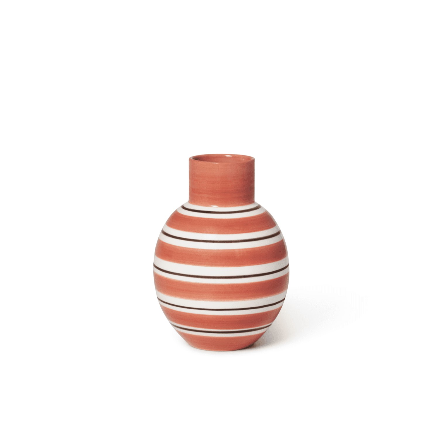 [0] => The Omaggio Nuovo Vase in Terracotta is a revival of the classic Omaggio series, with a reinterpreted design. This faience vase sports an elongated neck and a pleasing rounded body with hand-painted stripes that alternate between red-orange bands and white bands with a thinner brown stripe. Its minimalist design enables it to display a small bouquet or stand on its own as an accent piece. Place the Omaggio Nuovo on any shelf, tabletop, or credenza to show off this new classic.