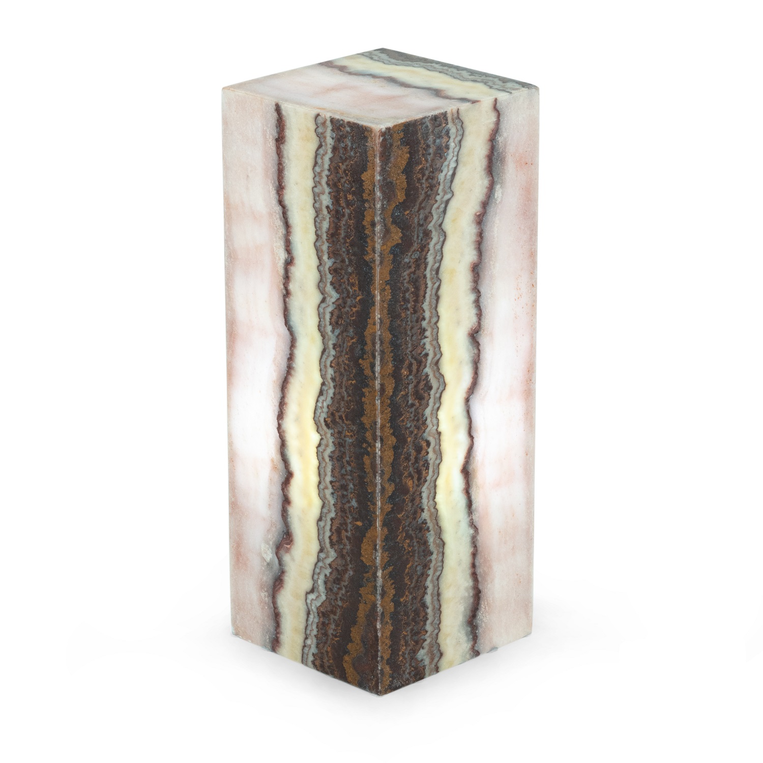 The Onyx Lamp is a handcrafted work of art made from onyx stone mined in the mountains of southern Mexico. Only the finest rough material is used to create these art-of-the-earth lamps and the natural layered patterns within the warm-toned browned structure create variable textures that ensure every piece is unique. This design is both functional and decorative.
