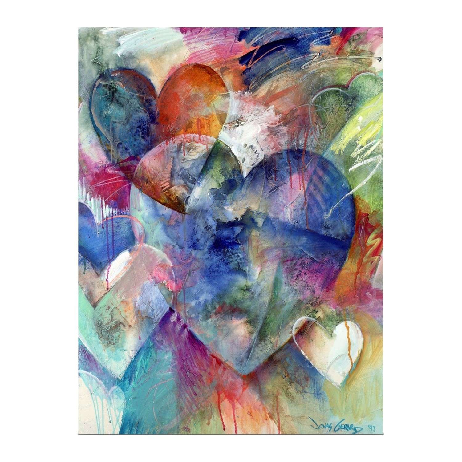 [0] => Opening the Heart is a wall artwork by Jonas Gerard, featuring the overlapping outlines of five hearts painted in shades of blue, pink, yellow, orange, and white. The broad, loose brushstrokes create visual texture, while splattered paint and scribbled lines add a sense of dynamism. Available with a glossy finish, Opening the Heart is an ideal artwork for pop art fans and color enthusiasts.