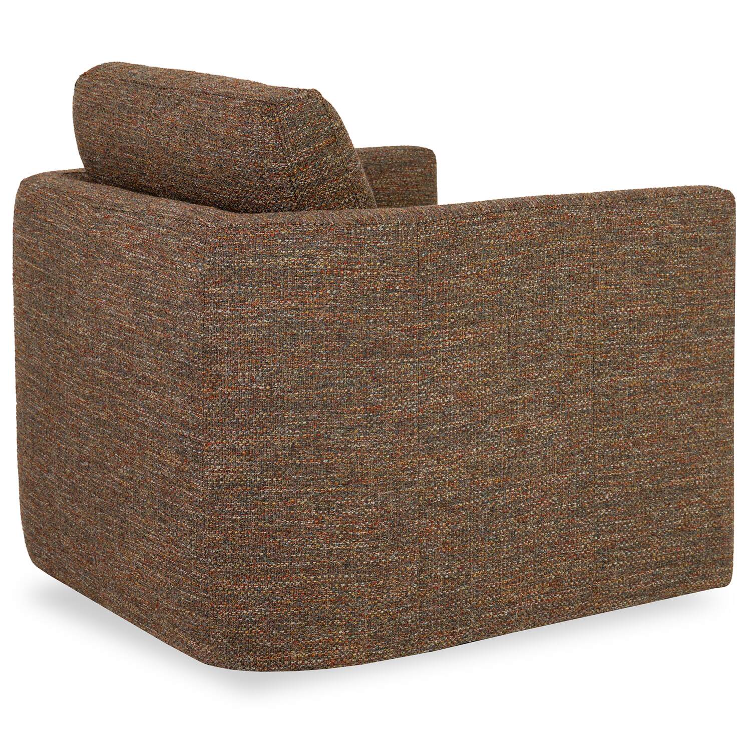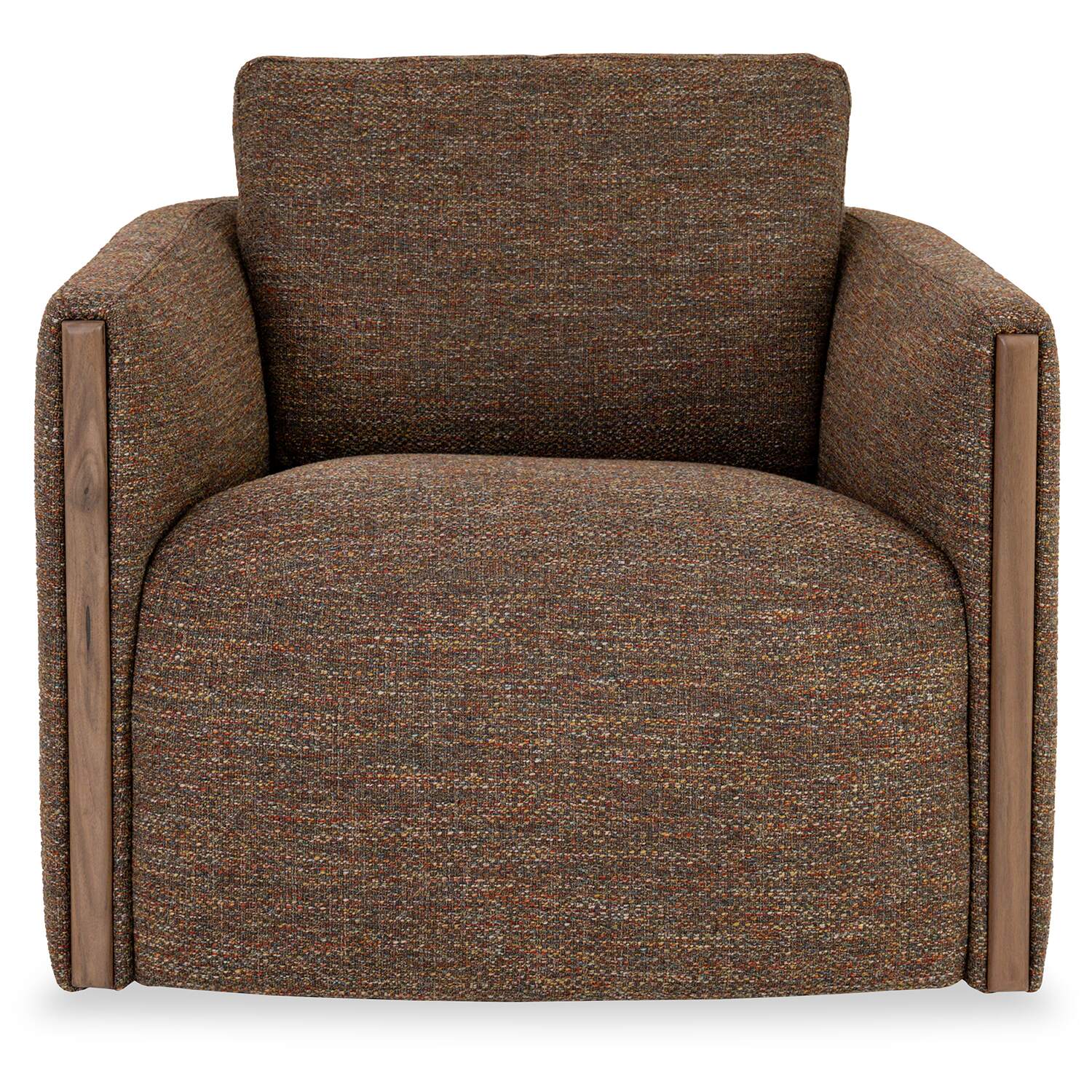 [0] => The Ophrys Swivel Chair features fun, variegated fabric with threads of brown, red, yellow, teal, and beige reminiscent of retro color palettes from the 60's and 70's. Canaletto walnut trim on the front of each armrest adds an extra touch of style. Made in Italy by Incanto, Ophrys has soft cushioning that welcomes you to relax, as well as a 360-degree swivel base that lets you move comfortably between lounging, conversing, watching TV, and more. With its clean, classic form and playful upholstery, Ophrys can easily complement eclectic, transitional, and modern interiors.