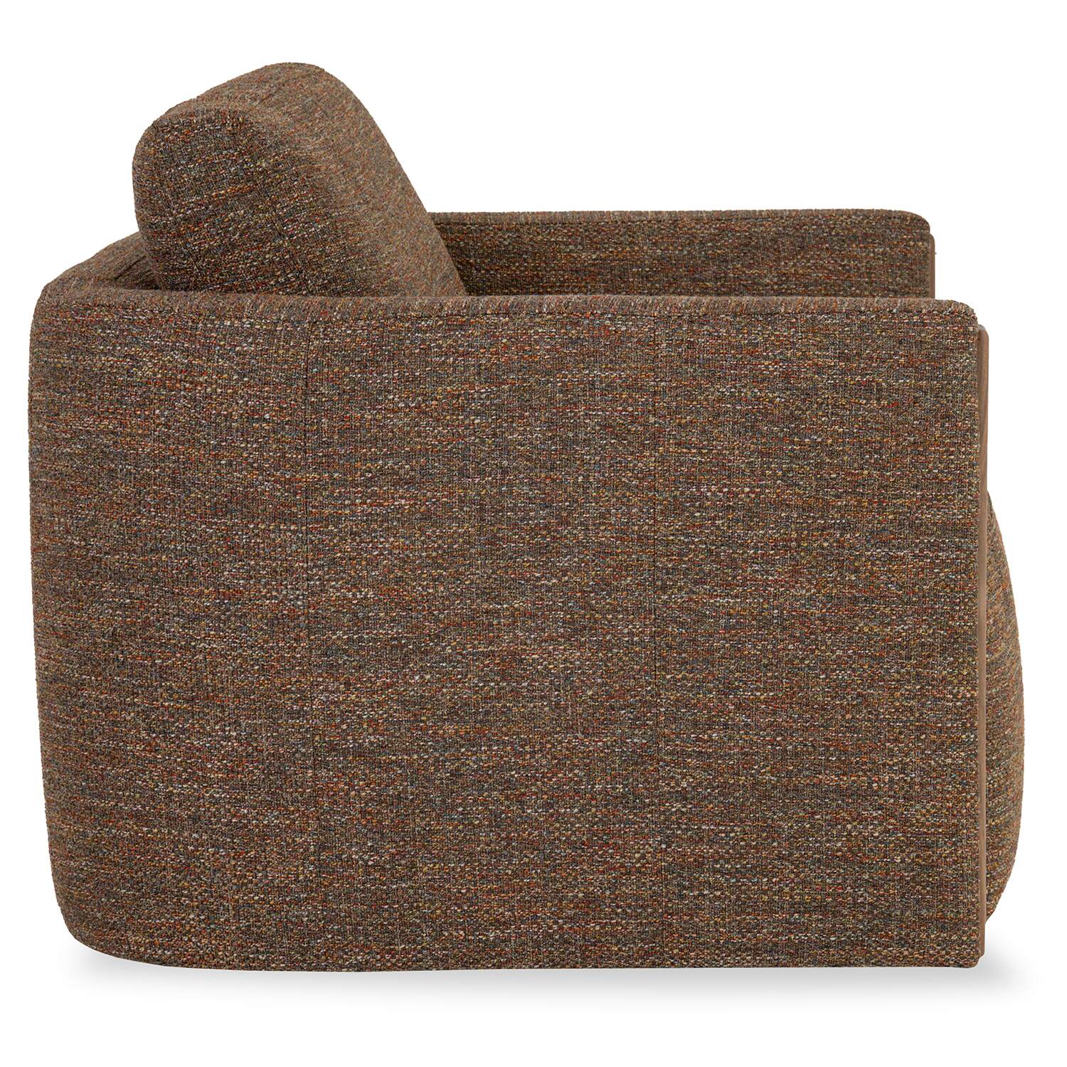 The Ophrys Swivel Chair features fun, variegated fabric with threads of brown, red, yellow, teal, and beige reminiscent of retro color palettes from the 60's and 70's. Canaletto walnut trim on the front of each armrest adds an extra touch of style. Made in Italy by Incanto, Ophrys has soft cushioning that welcomes you to relax, as well as a 360-degree swivel base that lets you move comfortably between lounging, conversing, watching TV, and more. With its clean, classic form and playful upholstery, Ophrys can easily complement eclectic, transitional, and modern interiors.