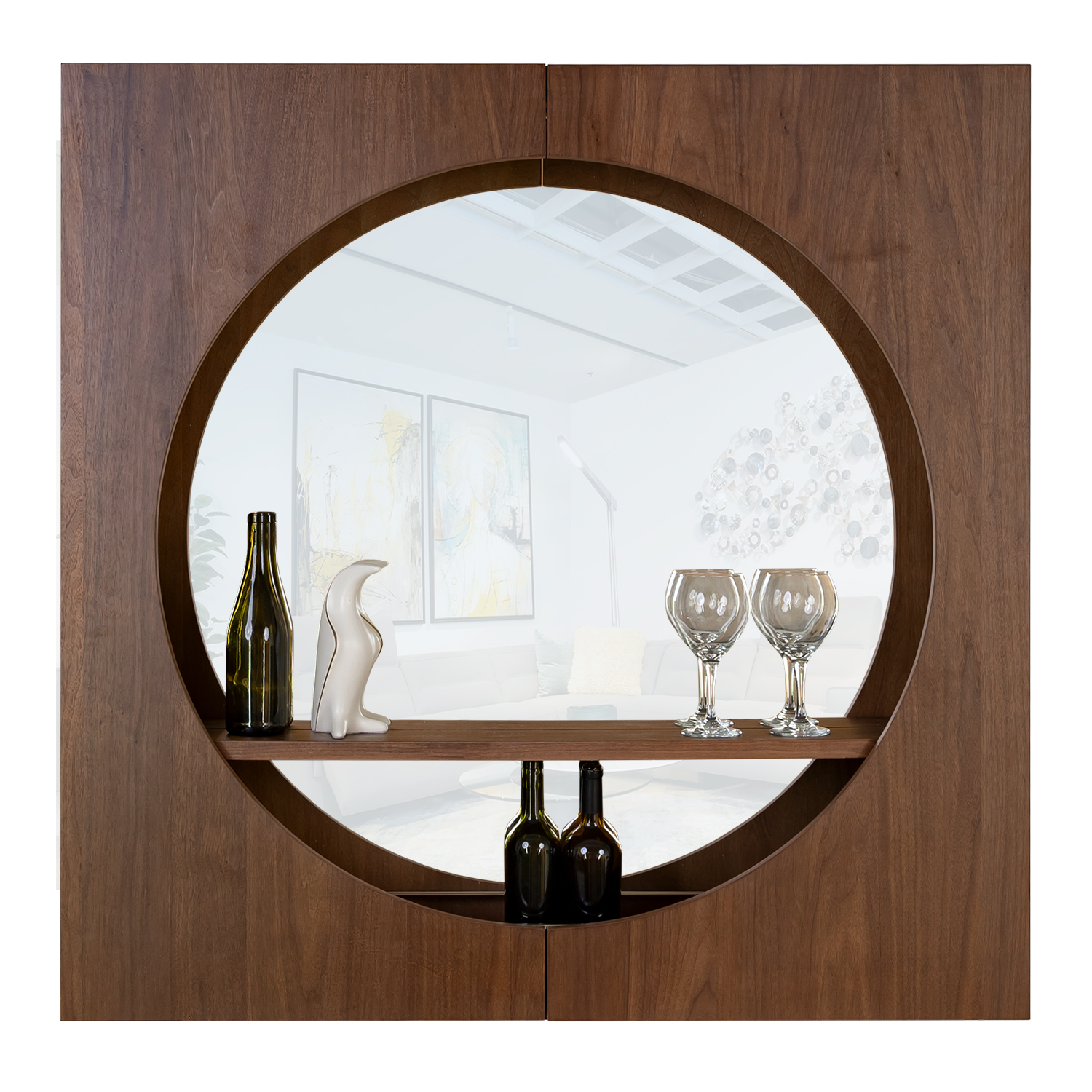 [0] => The Orbit Mirror Wall Bar unites multifunctional contemporary design with modern technology to bring your gatherings to the next level. Available with a walnut finish, this wall-mounted bar features two doors with a circular cutout that reveals a matching wooden display shelf within, as well as a mirrored inner surface for a clean, bright look. Open the doors to access additional storage for bottles and glasses, including a hanging wine glass rack along the top edge. Remote-controlled LED lights in eight colors add a festive mood -- and can even change colors to the beat of your music for the ultimate party vibe.