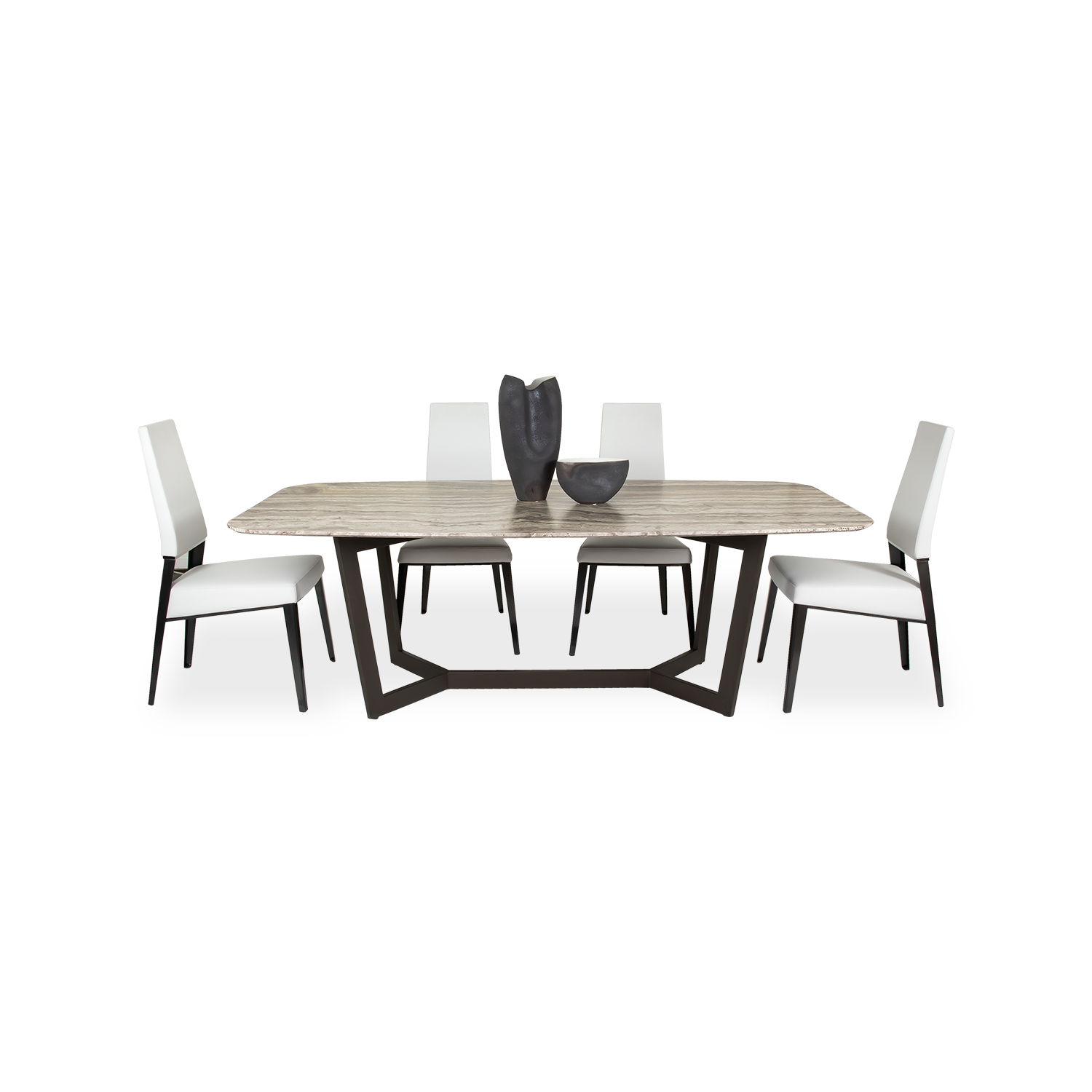 [0] => The Oscar Dining Table has a sculptural, contemporary design, with an angular base in metallic Rust Bronze and a boat-shaped top in Glam travertine. The rounded edges of the tabletop gently contrast against the squared lines of the base, while the grey and brown tones of the travertine complement the bronze finish of the legs. Oscar's sophisticated look will make it the centerpiece of your dining room.