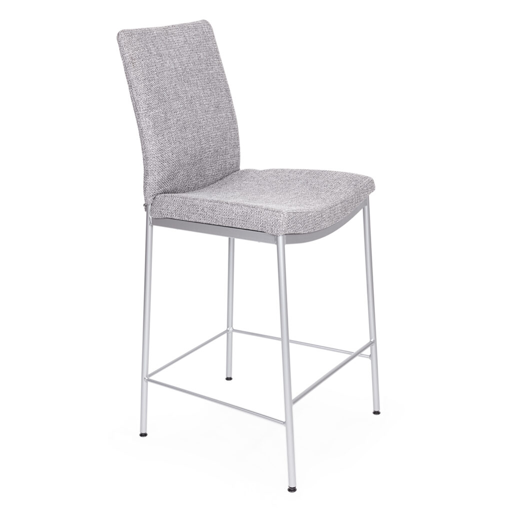 [0] => The Osten Counter Stool is sophisticated and contemporary, with clean lines, a rounded seat, and tall seat back. A smooth magnetite frame supports the seat and backrest, which are upholstered in durable tuxedo fabric with a chunky weave and variegated tones of black, grey, and white. The gentle curve in the seat back and the dip in the seat provide support, and a horizontal crossbar serves as a footrest for additional comfort. Osten's minimalist design, neutral fabric, and stylish lines make it the ideal versatile piece for any kitchen or dining space.