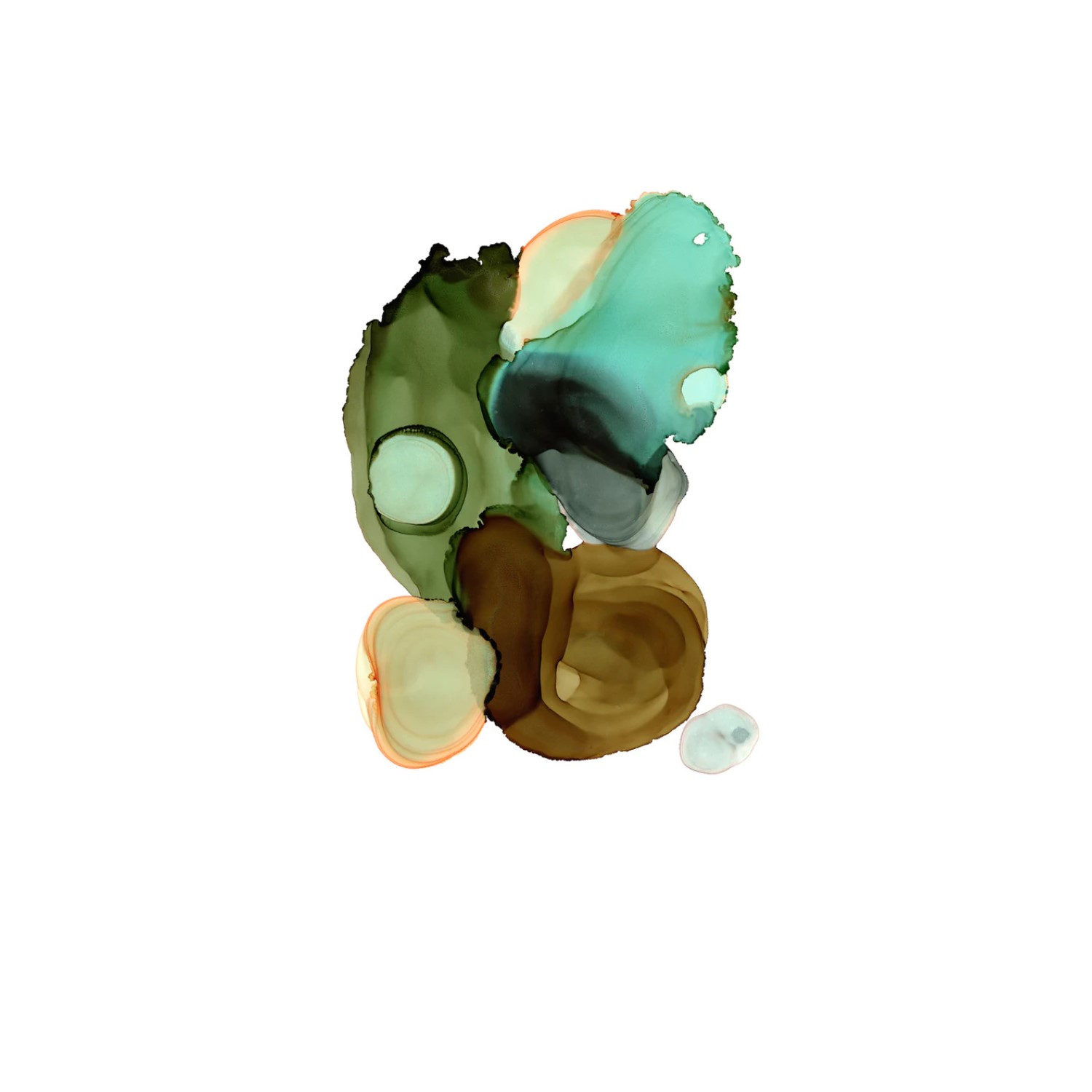 [0] => Out My Window is an abstract artwork by Jessica Torrant featuring a gentle mix of organic shapes and colors. Spots of blue, green, brown, and orange blur together under a glossy surface, evoking the forms and atmosphere of natural landscapes.