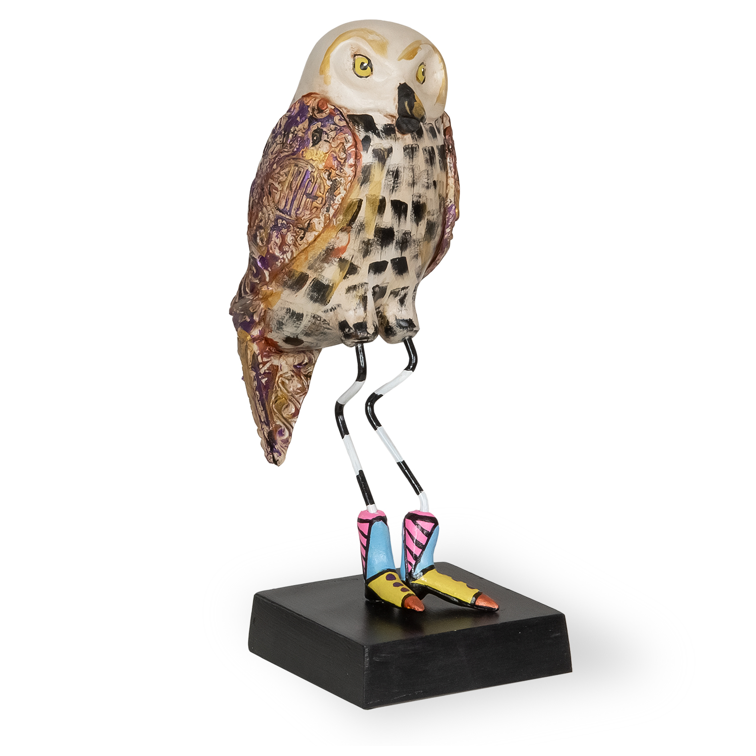 [0] => The Large Owl Bird, by artist Steven McGovney, is a multimedia sculpture full of unique textures and fun details. This owl stands in a dynamic pose, slightly tilted back, and features multicolored boots, striped legs, and textured impressions on its wings. Lovingly handmade from low fire clay, with an oil and acrylic finish, steel legs, and a pottery base, the Large Owl Bird will add instant personality to your bookshelf, table, or credenza.