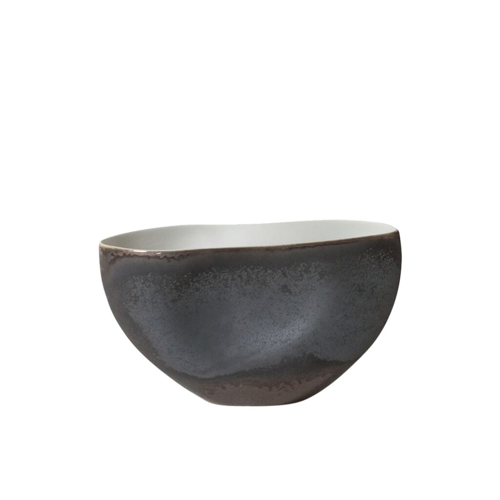 The Oxus Small Pinched Bowl is minimalist and contemporary, with an organic curved silhouette and a two-toned look. Made from porcelain, the outside of the bowl is finished in a reactive glaze that produces a bronze matte finish with scattered crystalline metallic patches. Place the Oxus Small Pinched Bowl by itself or paired with the other items in the Oxus collection on your table, credenza, or shelf.