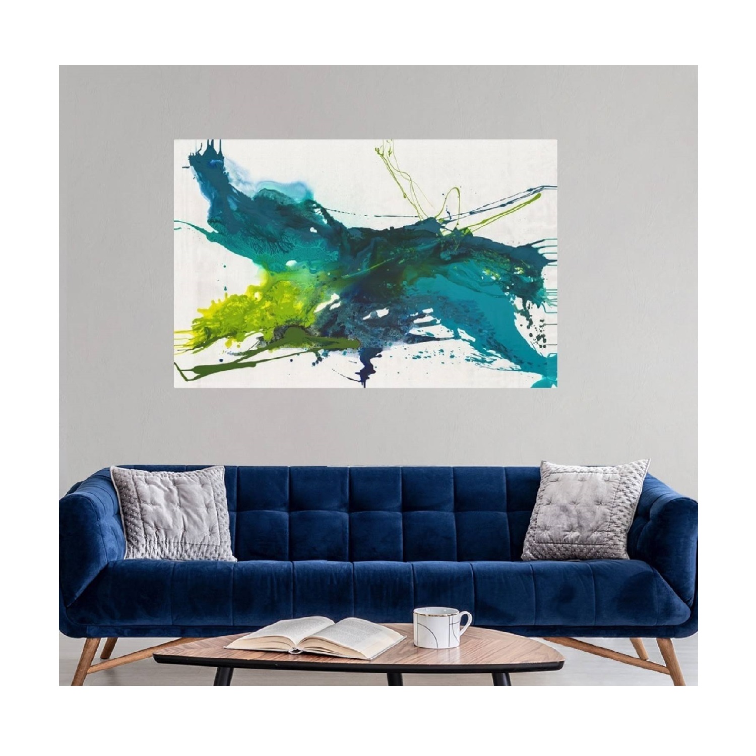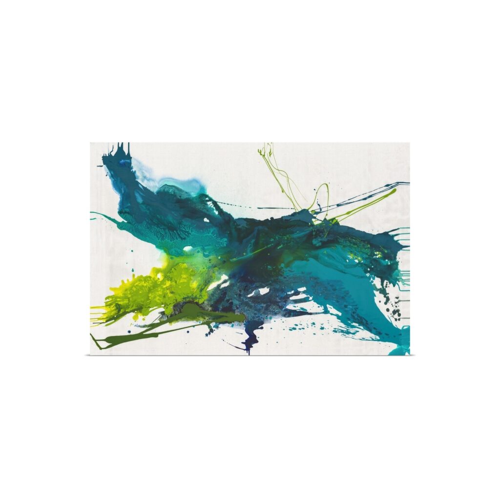 Pacific Current is an abstract contemporary artwork featuring splashes of aquatic colors on a white background. Hues of deep blue, sky blue, green, and yellow merge under a glossy surface to evoke the flow of a rushing river. Bring vibrancy and tranquility to your interior with Pacific Current.