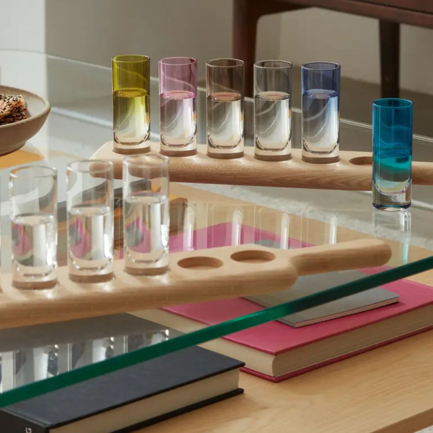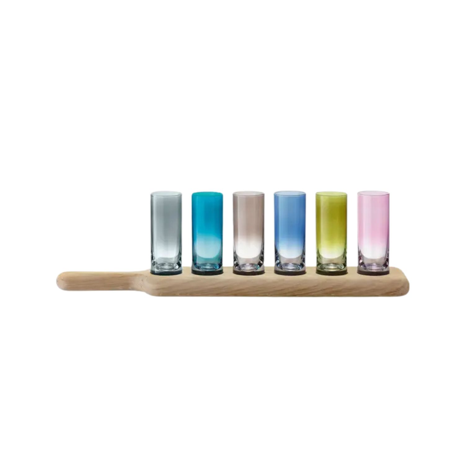 Inspired by serving pieces from Tirolean mountain bars, the Paddle Shot Set includes six ombre shot glasses in grey, teal, brown, blue, chartreuse, and pink that nestle securely within a wooden paddle. Designed with care by LSA International, the paddle is made with FSC-certified oak wood and finished by hand for a smooth feel. Perfect for serving your favorite spirits, the Paddle Shot Set will add color and fun to any gathering.