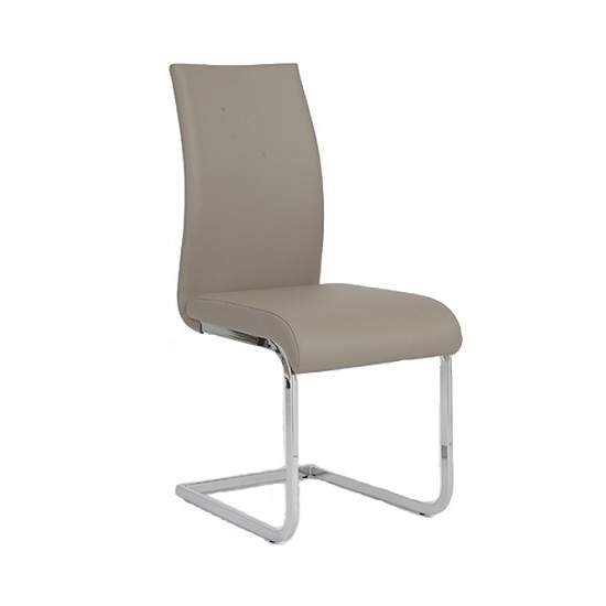 [0] => The Paige Dining Chair, available in taupe leatherette, is characterized by its graceful curves, with a back that flows gracefully into the seat and then into the legs, creating a feeling of continuous movement. Designed by Studio Design Group, this chair has a chrome sled base that allows it to fit easily underneath any dining table and imbues your space with a contemporary vibe.
