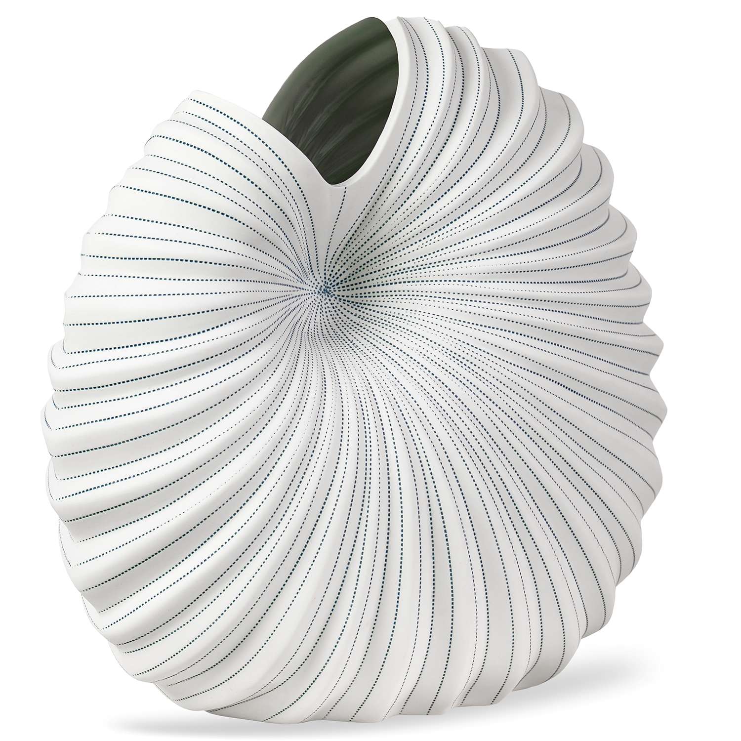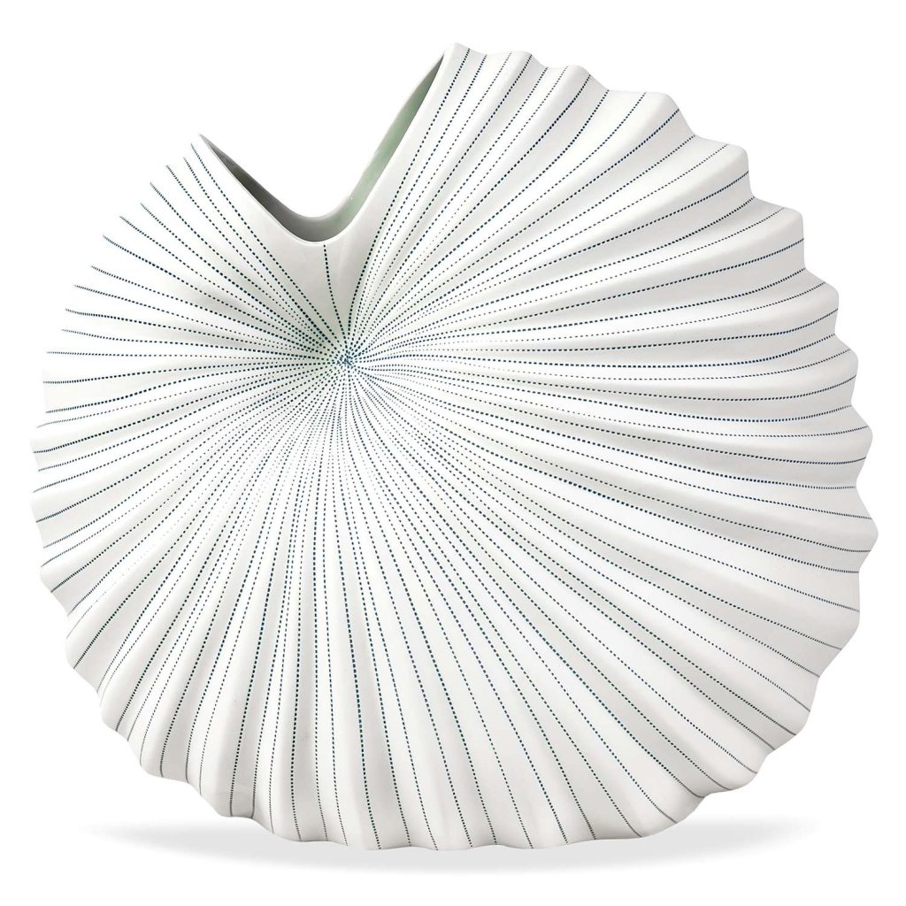 The Palm Large Vase is handcrafted from off-white porcelain with a delicate pattern of thin blue dotted stripes radiating from a divot in the vase's center. Resembling a seashell, the Palm vase boasts a rounded, voluminous form with a ridged surface and an angled opening. Show off a tasteful bouquet in this watertight vase or display it with the companion Palm Small Vase to bring tranquil oceanside vibes to any room.