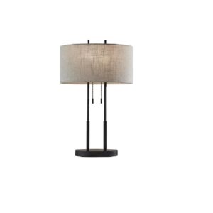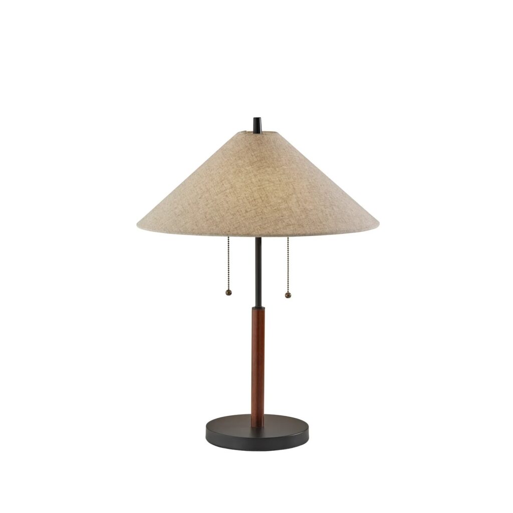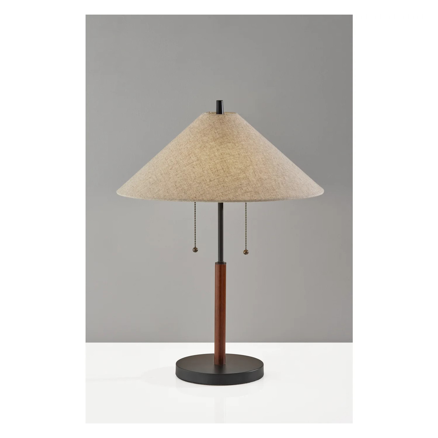 The Palmer Table Lamp blends warm-toned fabric and wood with sleek lines reminiscent of mid-century design. Palmer's shade is made of light brown textured fabric and has a wide circumference for a pleasingly proportioned look. The black metal base features a stylish walnut wood accent, while two pull chain switches let you choose a brighter or dimmer level of light.