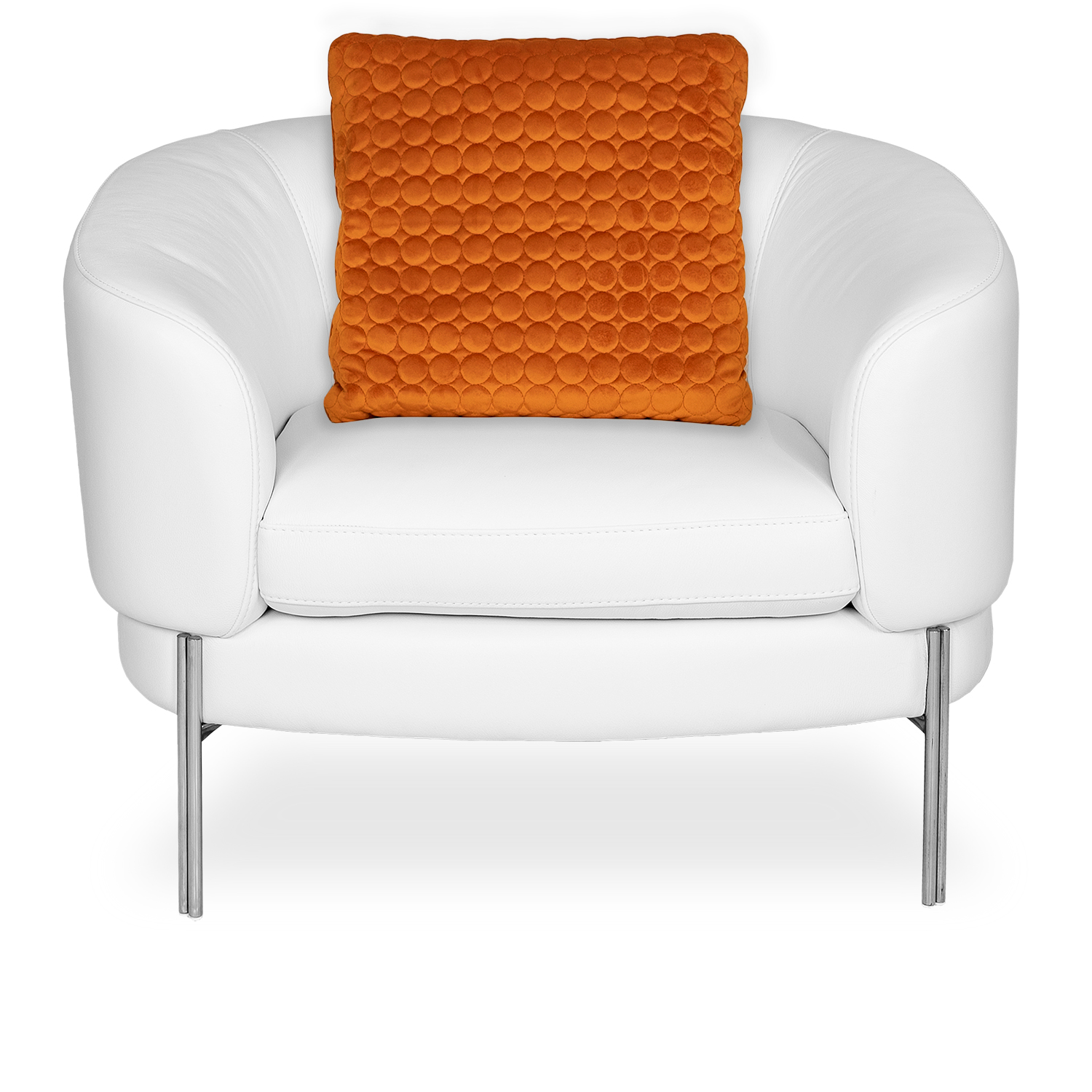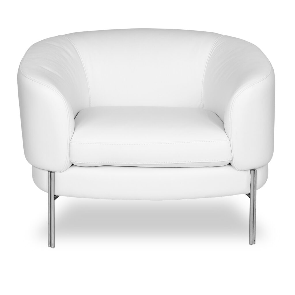 Made in Italy, the Paola Chair is upholstered in white Klimt leather and features a rounded shape with a backrest that curves organically into the armrests to surround you with comfort. Matching stitching on Paola's back and arms creates a tailored look, while slim double legs with a nickel finish add extra flair. With its full-bodied silhouette and soft cushioning, the Paola Chair will effortlessly embrace you as you relax and unwind.