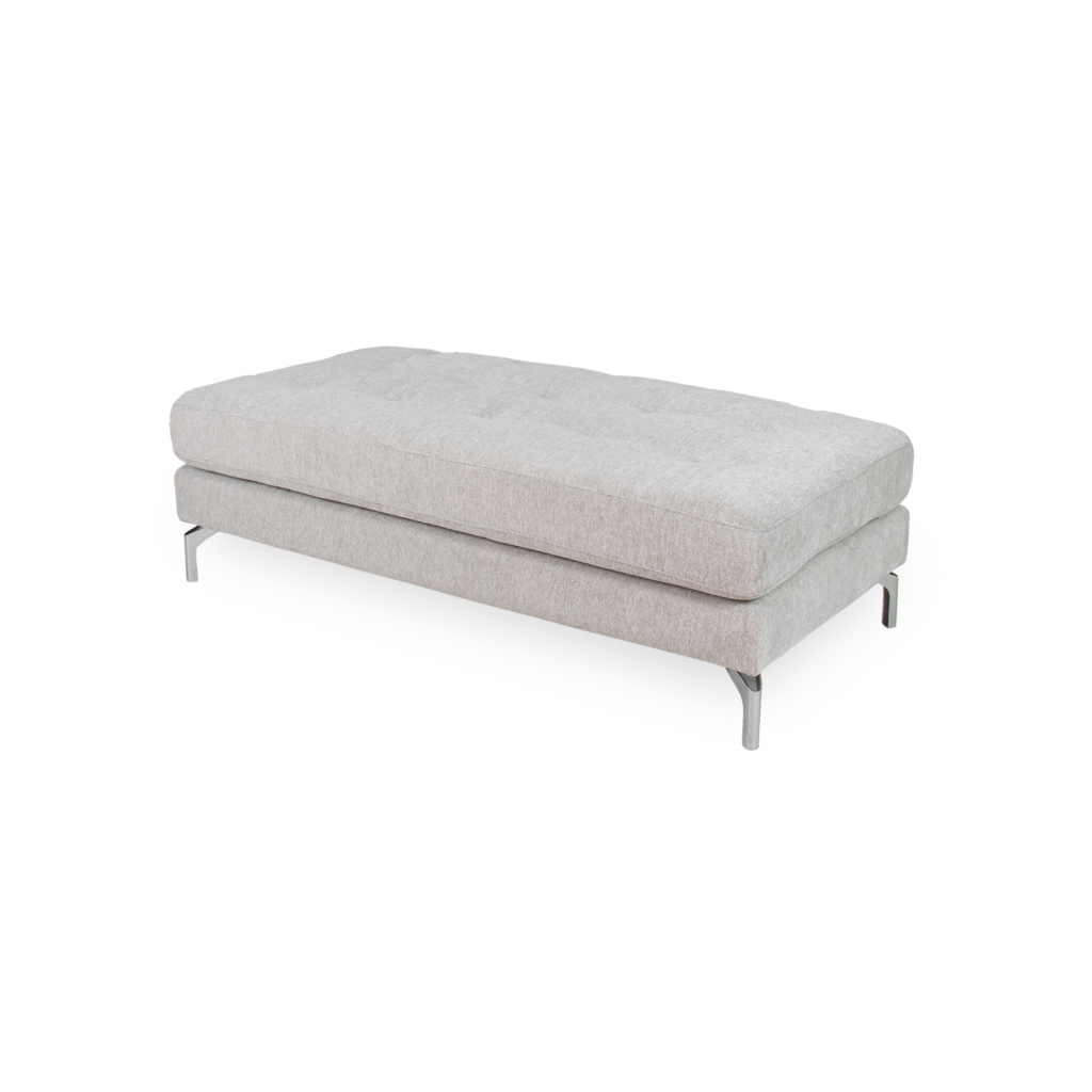 [0] => The Parker Ottoman is elegant and sleek, with silver Lillie fabric upholstery and steel metal legs that match the Parker Sectional. Its broad, rectangular shape has plenty of space to be used as a footstool, extra seating, and more, and the top features light tufting for a subtle modern touch.
