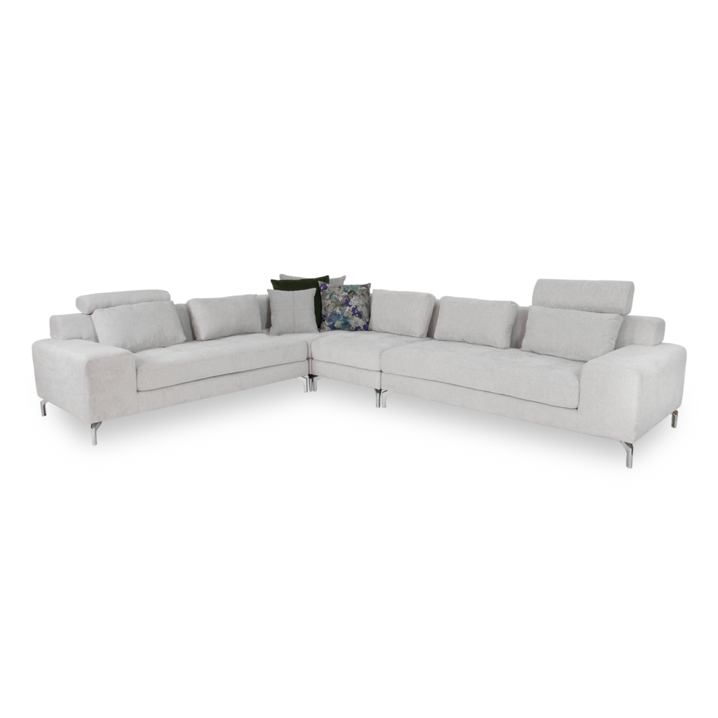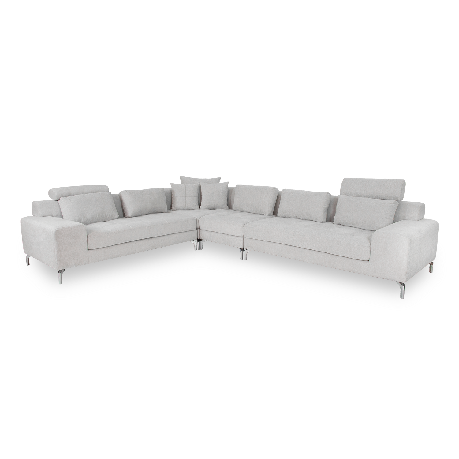 [0] => The Parker Sectional is elegant and sleek, with silver Lillie fabric upholstery and steel metal legs. Its broad, rectangular shape lends itself to entertaining, as well as settling in for a movie night or with a good book. Its long cushions feature light tufting for a subtle modern touch, and the headrests on the outer seats can be manually adjusted. The cool-toned fabric has variegated grey tones that add texture and are complemented by the cross-shaped stitching on some of the pillows, included with the sectional.