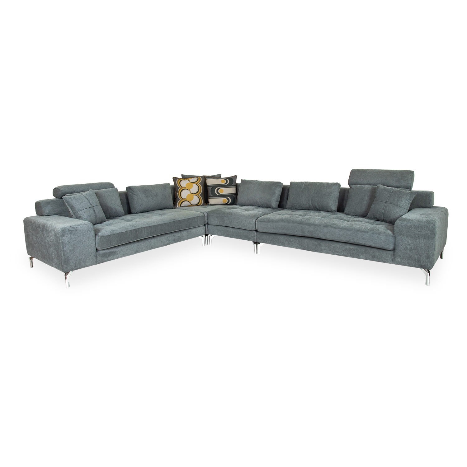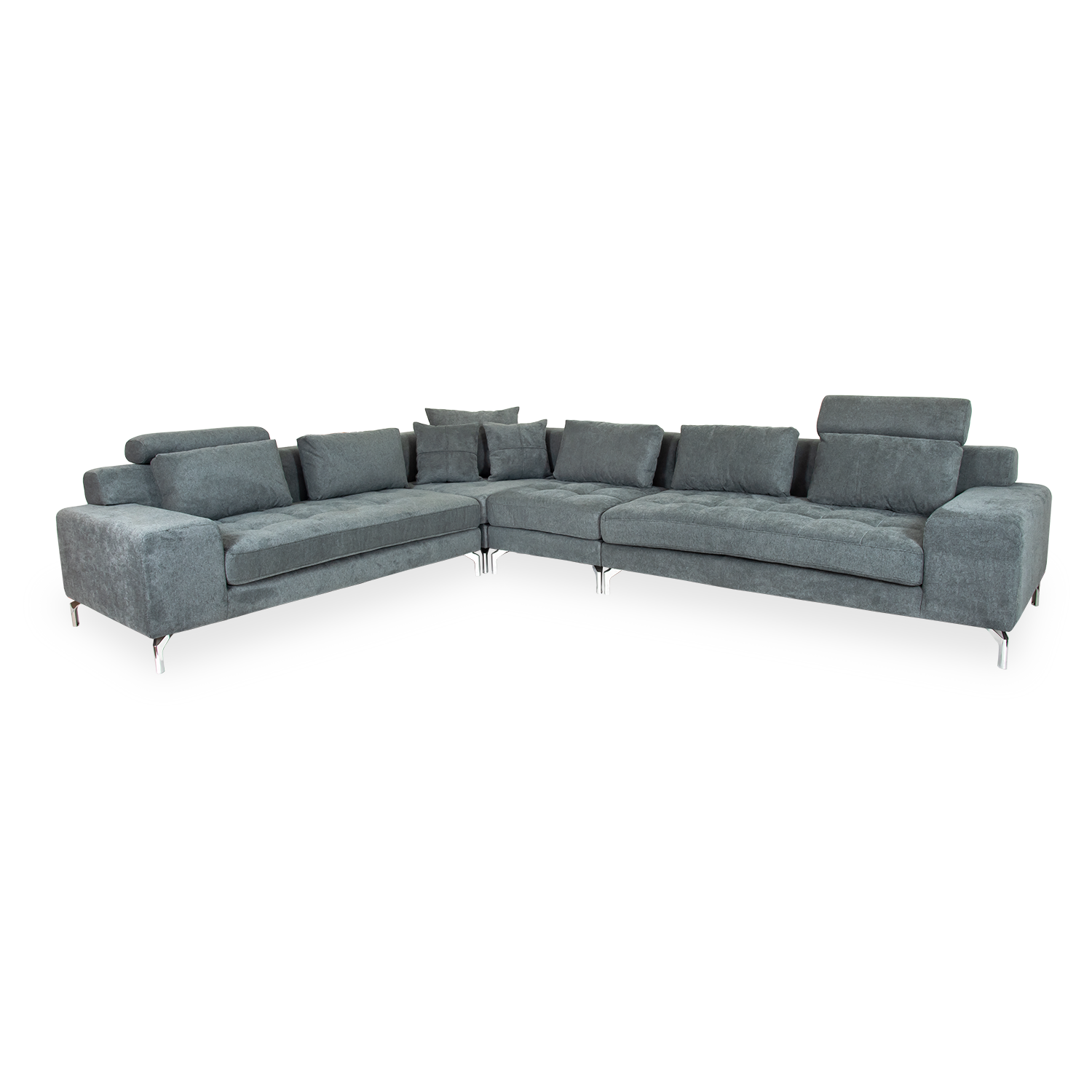 The Parker Sectional is elegant and sleek, with charcoal Lillie fabric upholstery and steel metal legs. Its broad, rectangular shape lends itself to entertaining, as well as settling in for a movie night or with a good book. Its long cushions feature light tufting for a subtle modern touch, and the headrests on the outer seats can be manually adjusted. The cool-toned fabric has variegated grey tones that add texture and are complemented by the cross-shaped stitching on some of the pillows, included with the sectional.