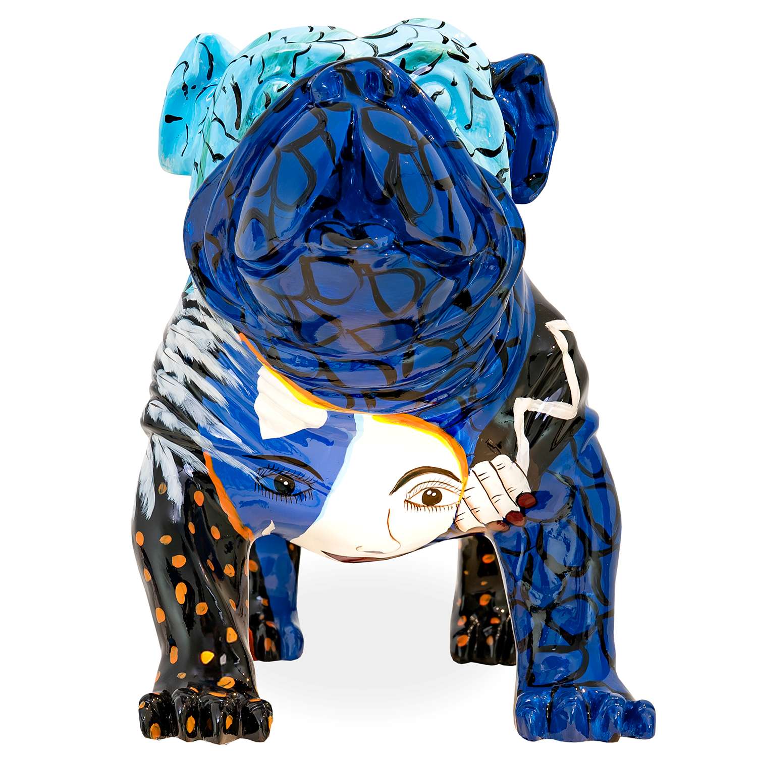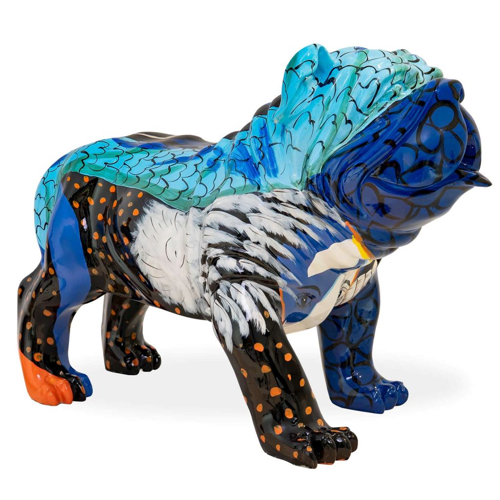 [0] => Full of personality and fun, the Parker's Dog Sculpture depicts a bulldog standing in an active, friendly pose with its tongue out. Parker's Dog is made of polyresin with a glossy finish and boasts a variety of designs across its body, including zigzags, dots, scale-like patterns, and feather-like patterns, painted in shades of blue, black, orange, and white. The image of a woman's face peeks out from the dog's torso, rewarding those who take a closer look.