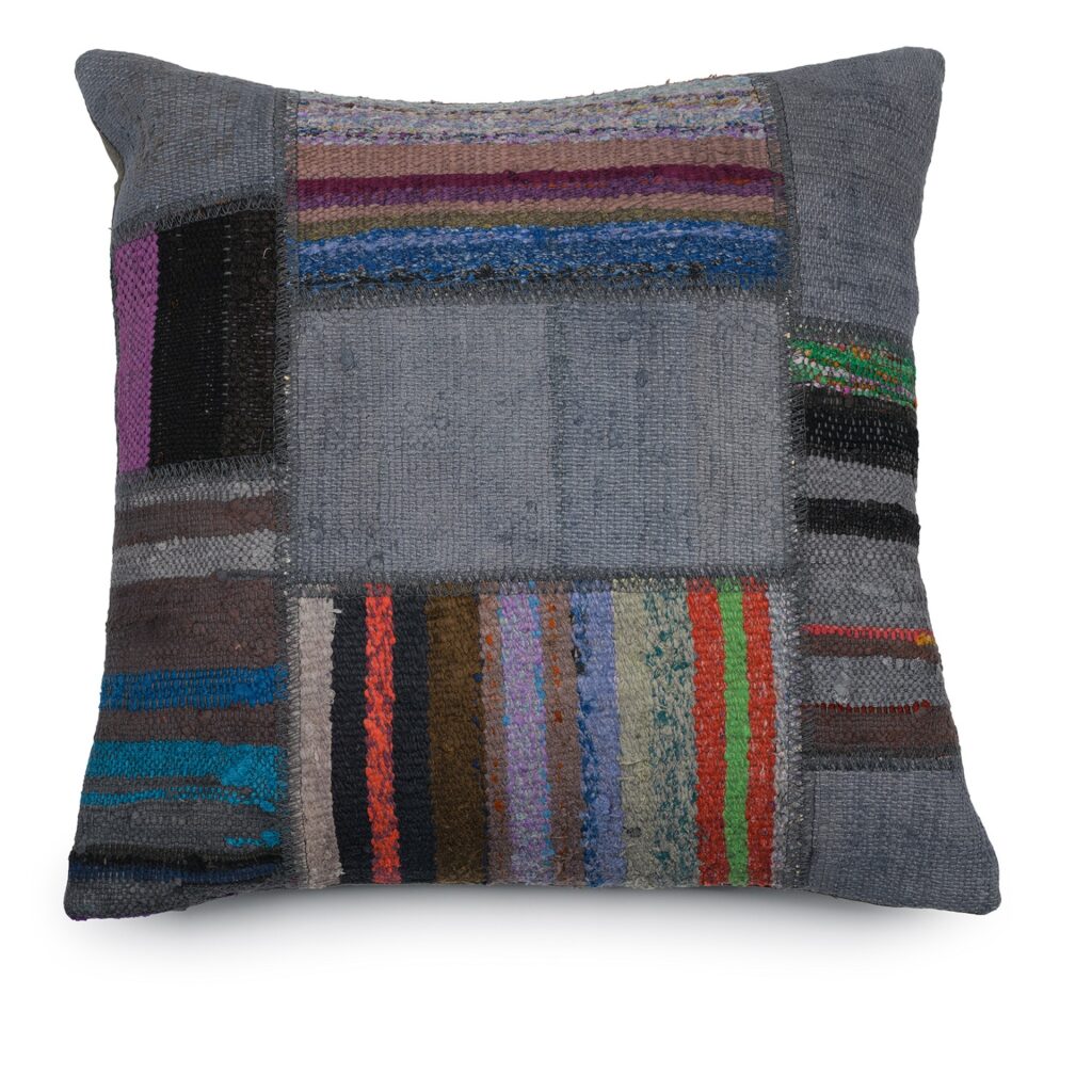 The Patchwork Pillow has an eclectic feel, with a multi-colored, textured fabric primarily in storm grey with patches of blue, purple, brown, pink, green, and more. The many colors present in the Patchwork Pillow can complement a wide variety of design environments and add a charming accent to any room.