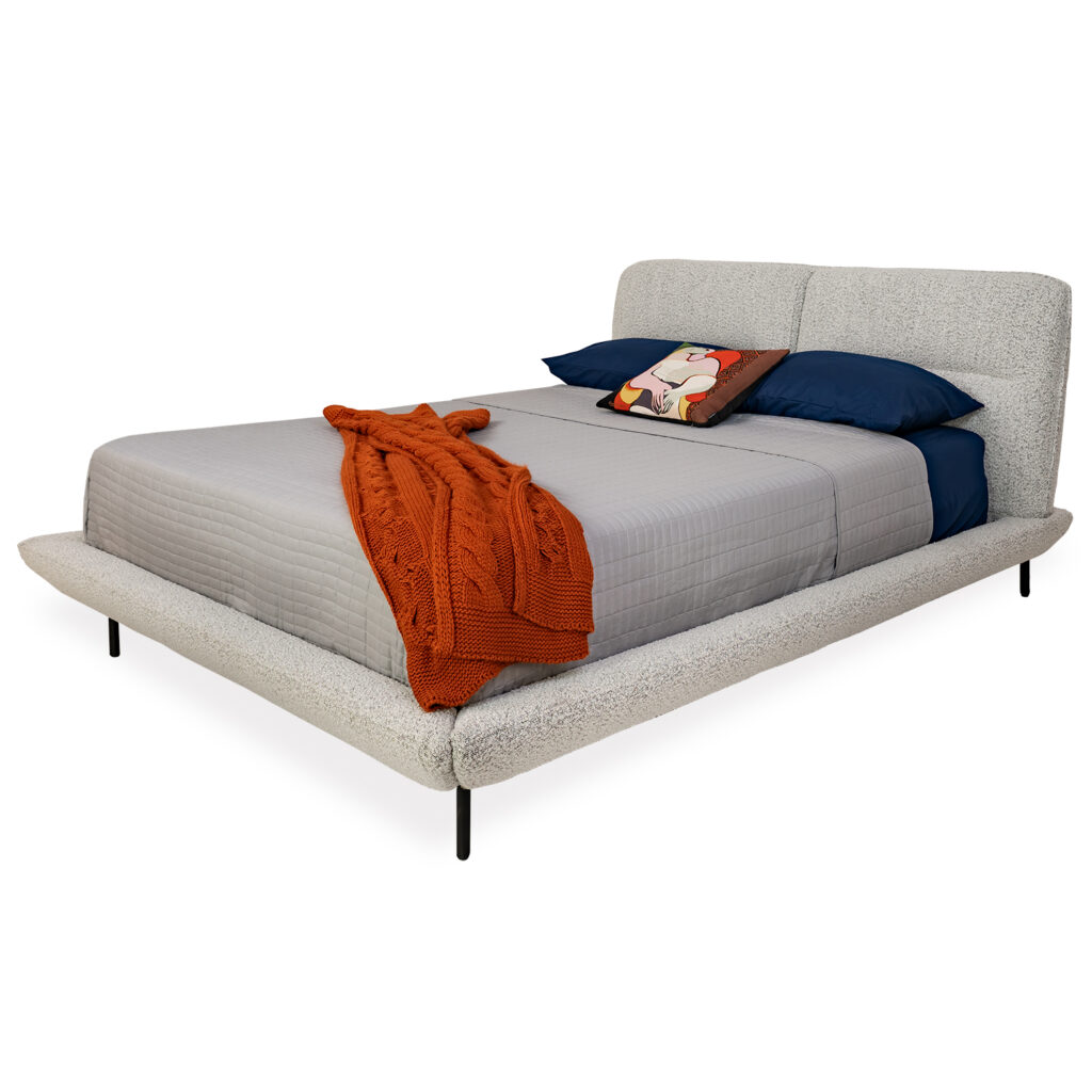 Tailored and cozy, the Paxon Queen Bed features midnight Belmont upholstery, a cream-colored fabric with dark blue threads woven in that create a variegated look and enhance its natural boucle texture. Paxon has a split-cushioned headboard with envelope-like accent stitching, providing the perfect backrest for reading or watching TV, and a broad, angled frame that boldly tapers in toward the legs. A minimalist black metal base delicately cradles the back of the headboard, and forms the supportive legs.