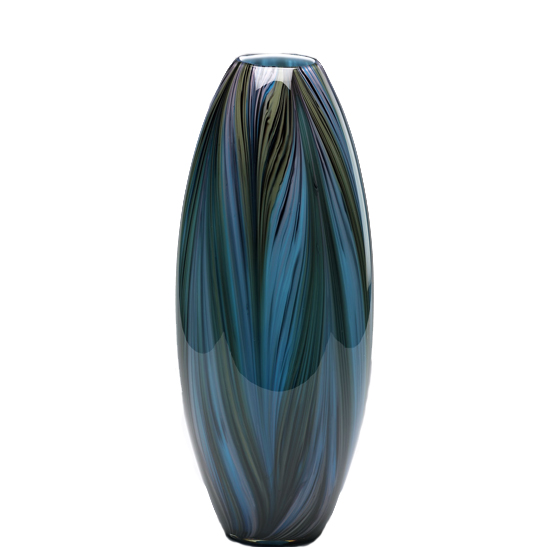 The Peacock Vase takes its inspiration from the brightly colored feathers of the peacock bird. Shades of blue, green, and purple swirl together to create delicate streams of color as seen in nature, and the gently curved silhouette allows the colors to shine. Whether placed on a shelf, credenza, or tabletop, the Peacock Vase will add vibrant style to any room.