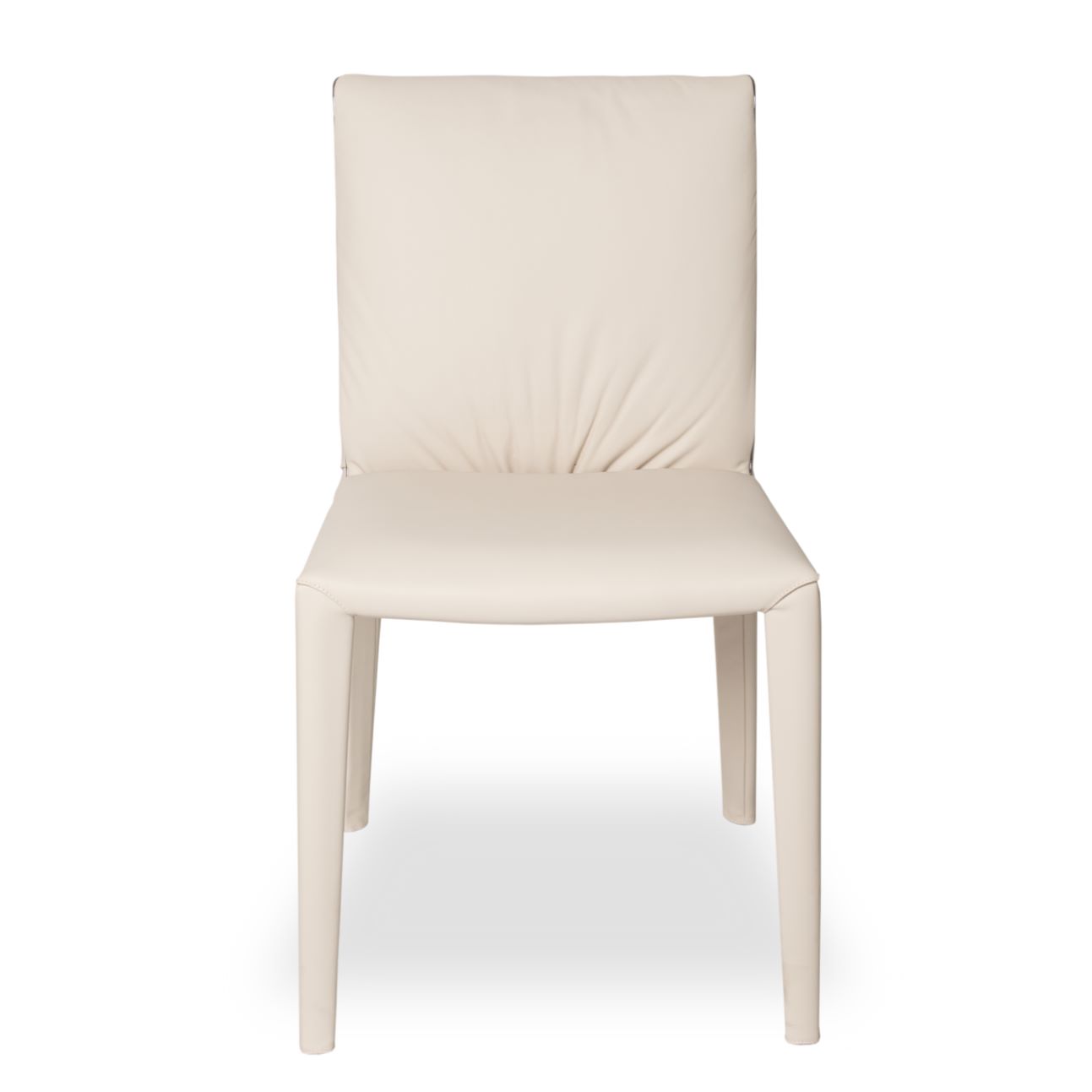 Featuring a steel frame fully upholstered in light beige leather and black chrome piping along the top of the seat, the Penelope Side Chair is minimalist and elegant. The seat back is gently curved to maximize your comfort, and the legs extend smoothly from the seat for a harmonious look. Penelope will bring timeless contemporary style to any living space, and its clean design means it pairs well with a vanity, desk, or dining table.
