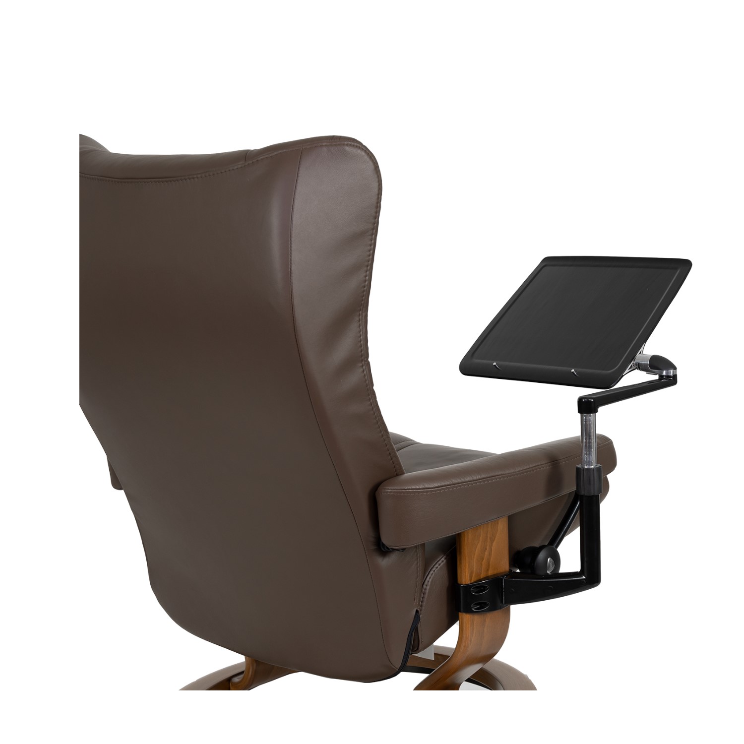 The Personal Table from Ekornes attaches to either side of Stressless® recliner models with a Classic base and is available in a black finish. The table has a height-adjustable arm to position the tabletop, and the angle can also be adjusted to be level or at an incline. Two small metal studs help keep a laptop in place so that you can work in greater comfort.