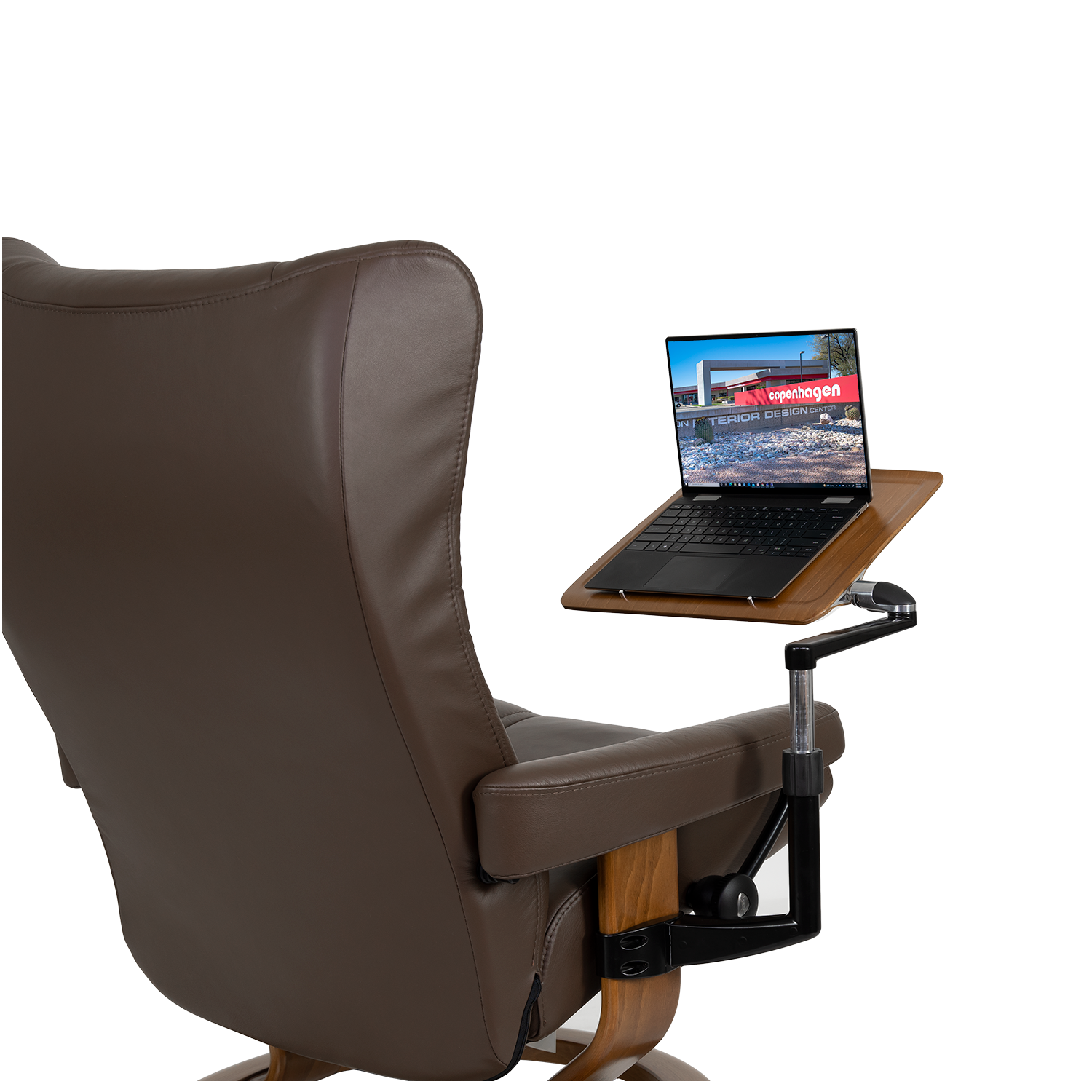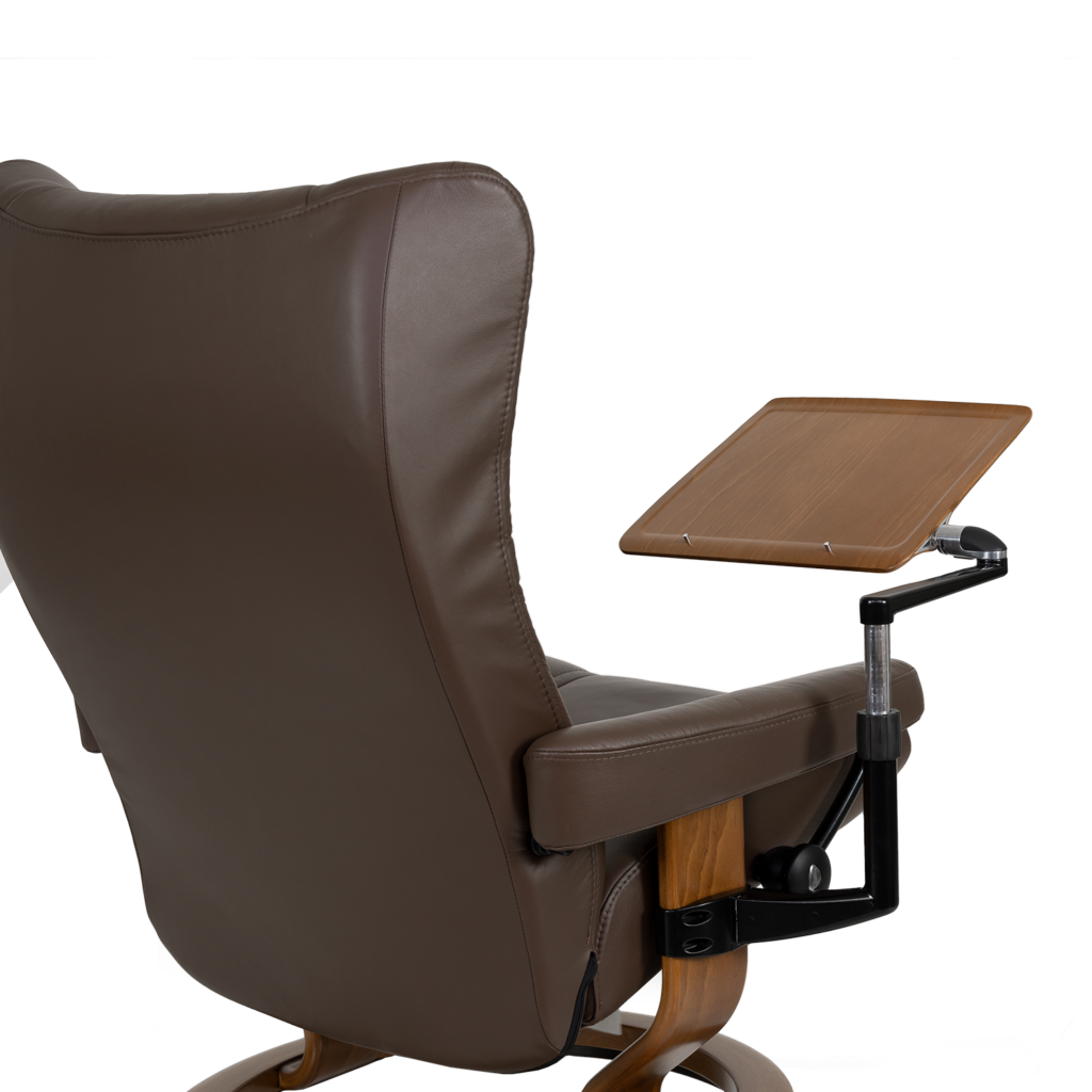 [0] => The Personal Table from Ekornes attaches to either side of Stressless® recliner models with a Classic base and is available in a teak finish. The table has a height-adjustable arm to position the tabletop, and the angle can also be adjusted to be level or at an incline. Two small metal studs help keep a laptop in place so that you can work in greater comfort.
