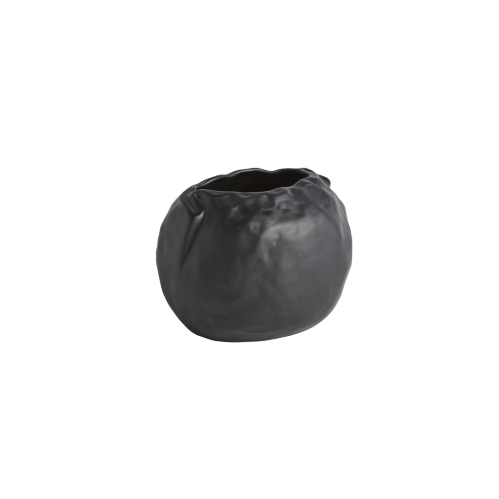 [0] => A reproduction of a vase crafted in Italy by two brothers, the Petale Vase has an organic pinched design with folded-over edges that are a testament to its handmade origins. Made of ceramic with a matte black finish, this vase's small size makes it perfect for a delicate yet modern bouquet.