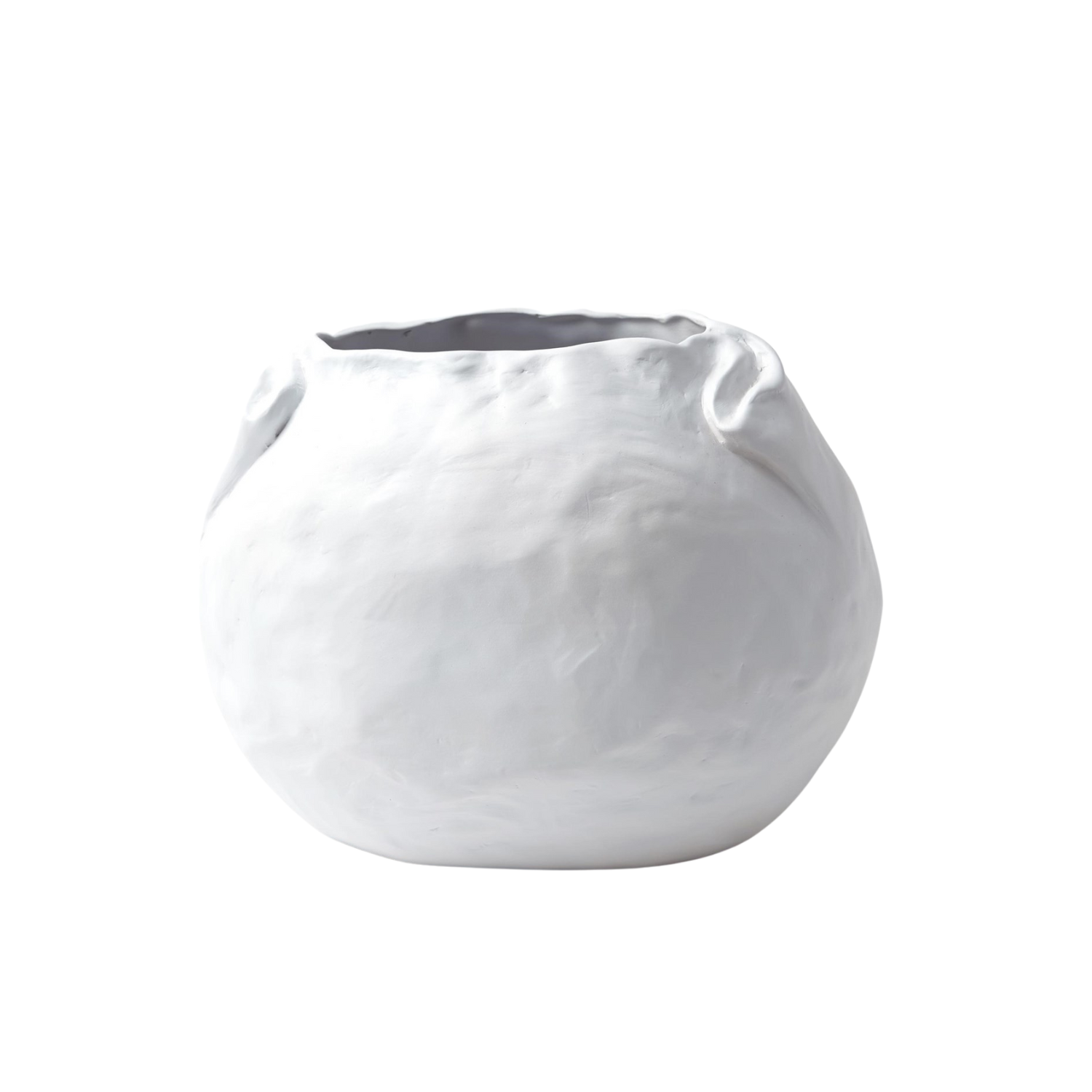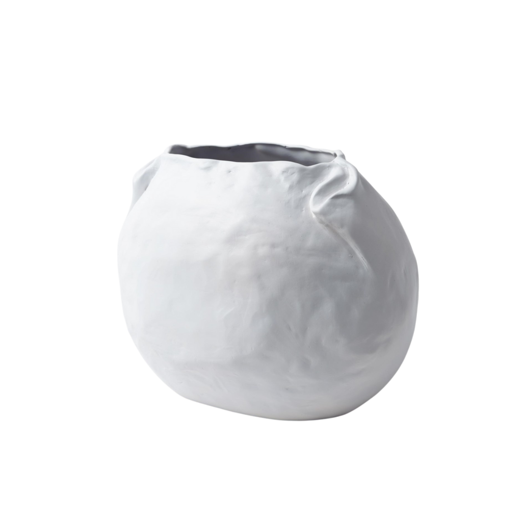 [0] => A reproduction of a vase crafted in Italy by two brothers, the Petale Vase has an organic pinched design with folded-over edges that are a testament to its handmade origins. Made of ceramic with a matte white finish, this vase's large size makes it perfect for a generous floral arrangement.