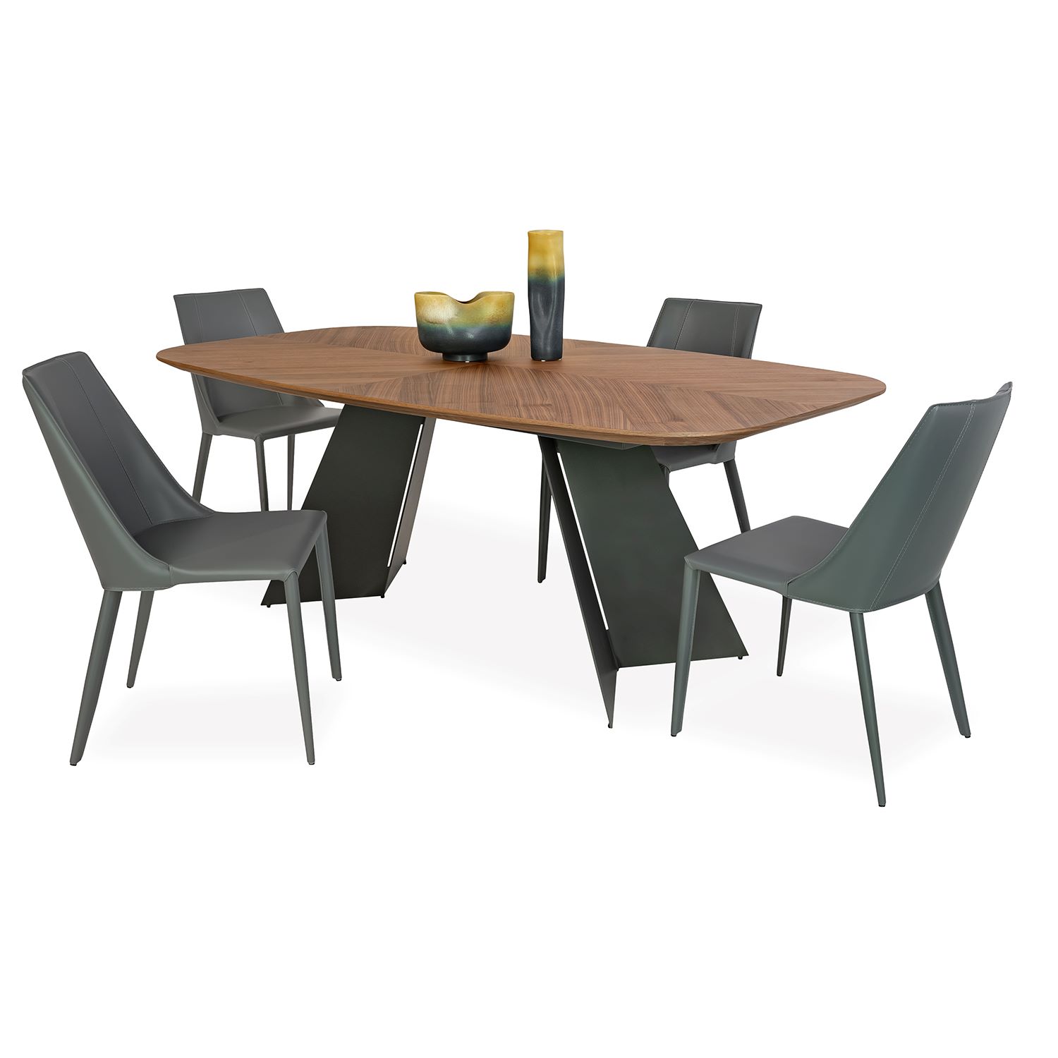 [0] => The Petra Dining Table has a sculptural, contemporary silhouette, with angled legs in matte dark grey steel and a tabletop in American Walnut wood veneer. The herringbone pattern of the wood top gives Petra a more traditional feel, while the wide metal legs maintain the table's modern flair. Petra's sleek style will make it the centerpiece of your dining room.