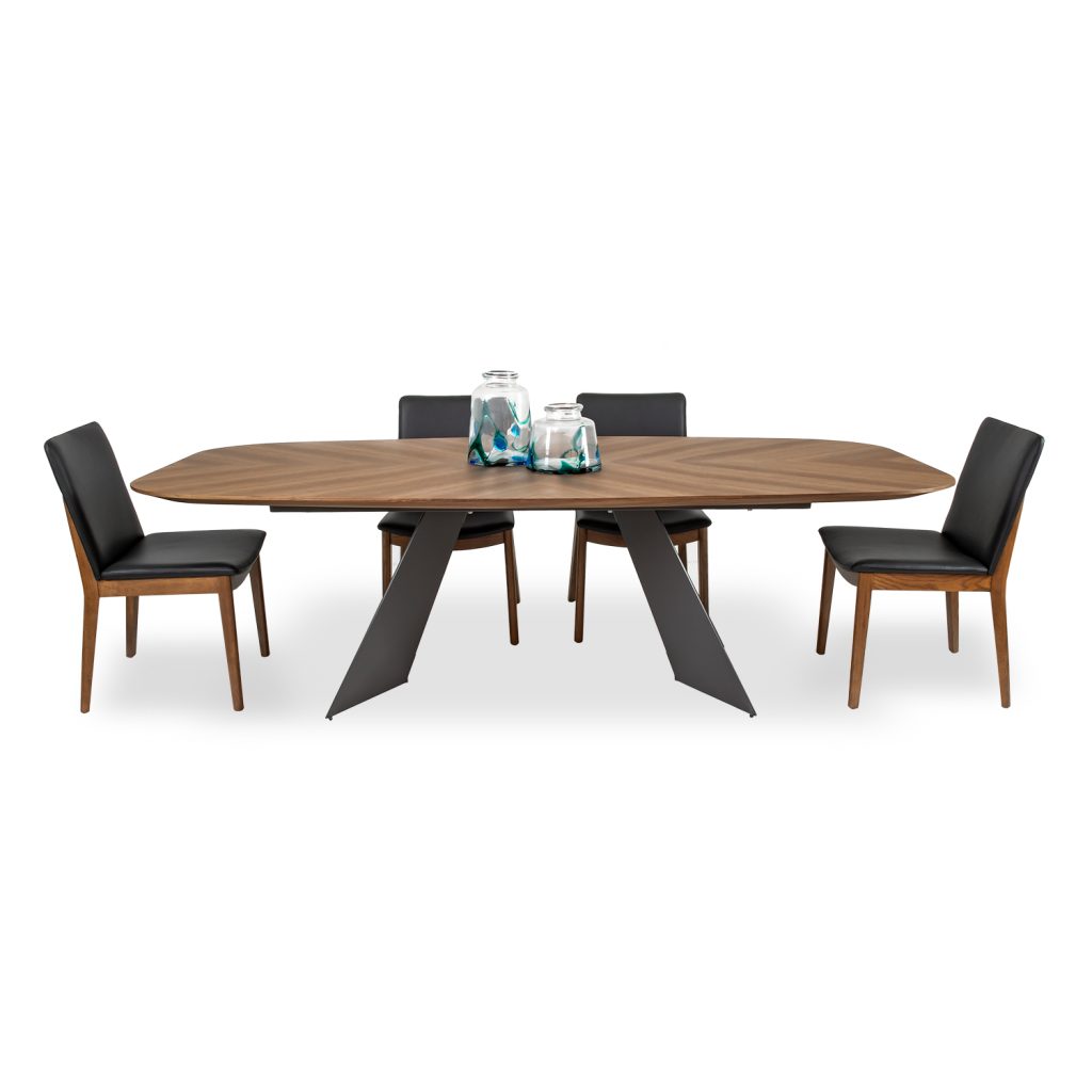 [0] => The Petra Dining Table has a sculptural, contemporary silhouette, with angled legs in matte dark grey steel and a tabletop in American Walnut wood veneer. The herringbone pattern of the wood top gives Petra a more traditional feel, while the wide metal legs maintain the table's modern flair. Petra's sleek style will make it the centerpiece of your dining room.