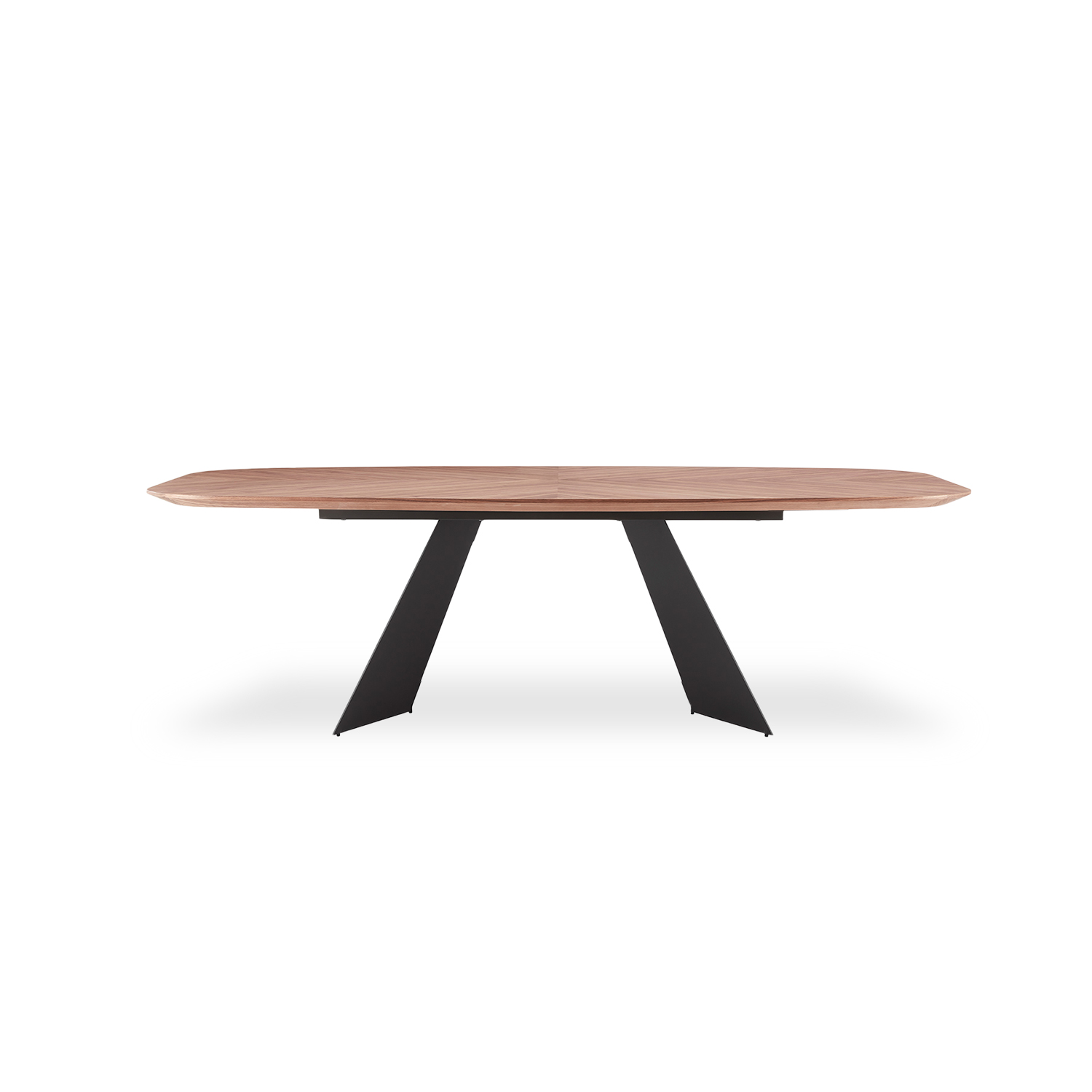 The Petra Dining Table has a sculptural, contemporary silhouette, with angled legs in matte dark grey steel and a tabletop in American Walnut wood veneer. The herringbone pattern of the wood top gives Petra a more traditional feel, while the wide metal legs maintain the table's modern flair. Petra's sleek style will make it the centerpiece of your dining room.