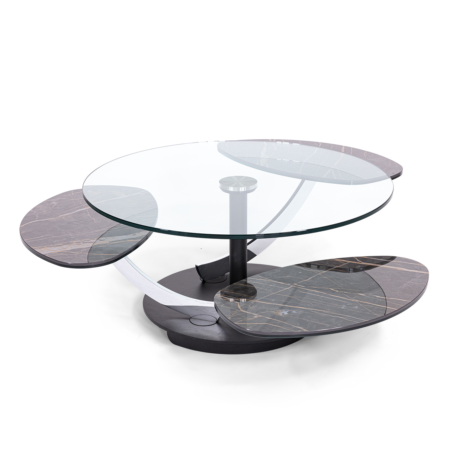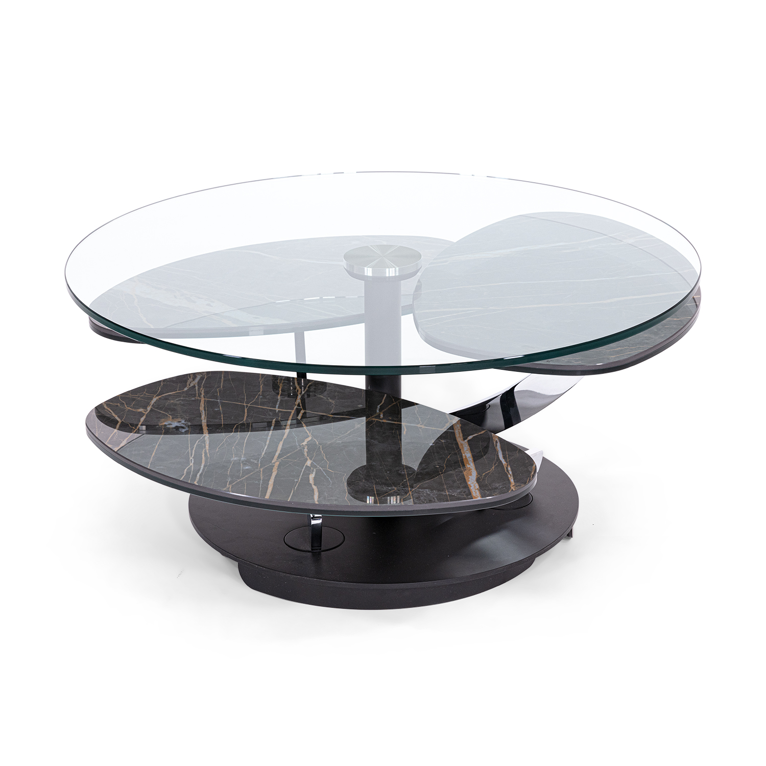 [0] => The Petres Cocktail Table, by NAOS of Italy, will be the highlight of your living space, with a glass tabletop and three black desire keramik marble lower tops in varying oval shapes. The tabletops rotate to form one compact center tabletop or rotate out to create more surface space for entertaining, serving, and more. With chrome supports and a matte black base, this piece is dynamic and versatile, providing ample space for any of your living needs.