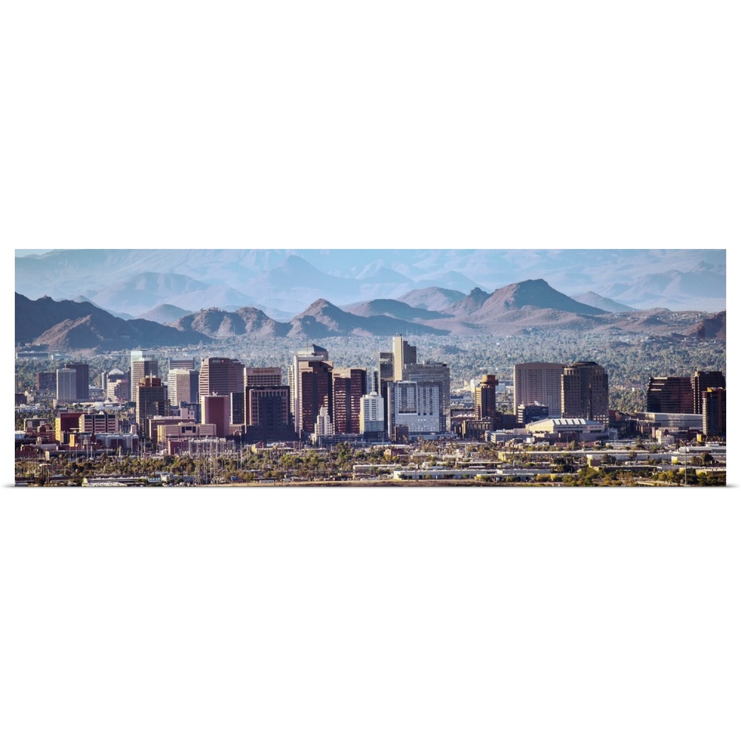 [0] => Phoenix Skyline is a panoramic photograph that captures the scale and vibrancy of downtown Phoenix, Arizona. The crisp forms of skyscrapers create a dynamic contrast to the organic shapes of hazy desert mountains in the background. Available with a glossy finish, this wall artwork is perfect for lovers of urban photography, or anyone with a special connection to Arizona.