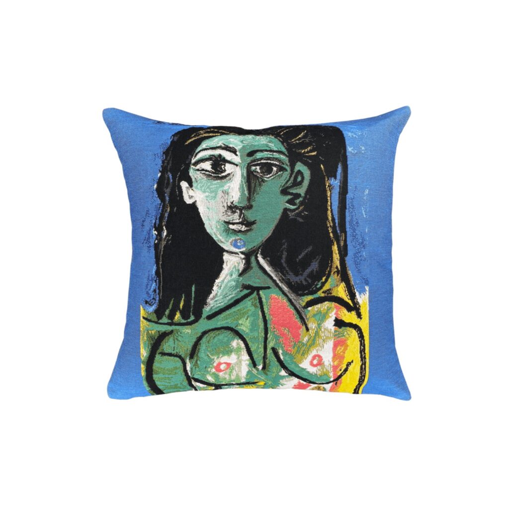 The Picasso - Buste de Femme (Jacqueline) (1963) Pillow will add a creative touch to your living space. Mid-toned blues, greens, black, red, and yellow form the features and contours of a woman with a neutral expression. What makes the pillow truly "art" is its jacquard style woven design that brings Picasso's work into your home, directly imported from France. The perfect gift or addition for an art enthusiast or anyone who loves a timeless masterpiece.
