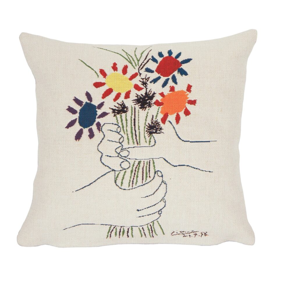 [0] => The Picasso - Fleurs Et Mains Pillow features bold primary colors of red, blue, and yellow against a beige background. Two hands hold the same bouquet of bright flowers, symbolzing a beautiful connection. What makes this pillow truly "art" is its jacquard style woven design that brings the work of Picasso to your home, directly imported from France. The perfect gift or addition for an art enthusiast, artist, or anyone who loves a timeless masterpiece.