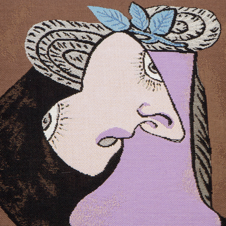 [0] => Bring art into your home with the Picasso, Le Chapeau de Paille (1936) pillow, made in France. The painting is rendered in vivid colors and textures, making it the definition of 'functional art.' The pillow is stuffed with duck down.