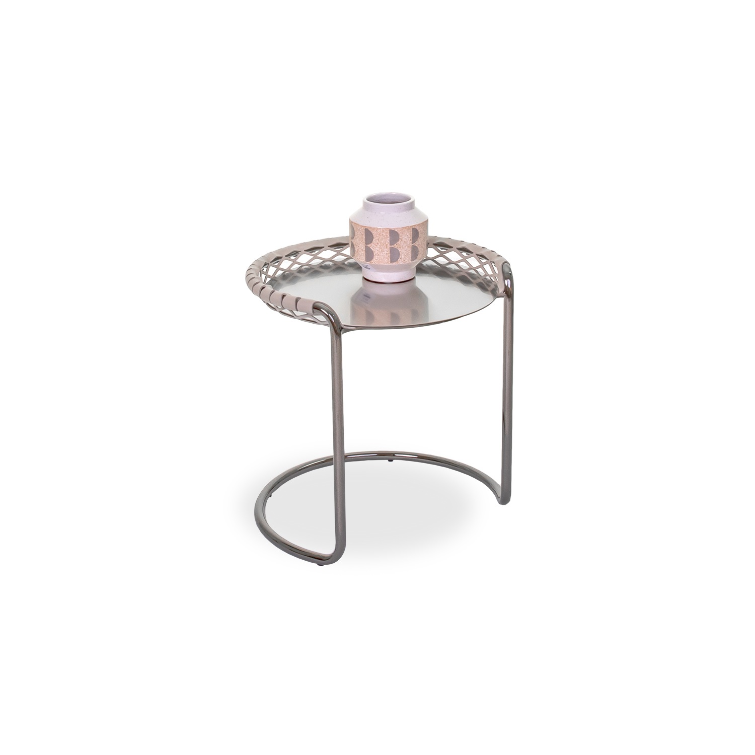 [0] => Inspired by multidimensional, abstract forms, the Piva Side Table, made in Italy, has a versatile, architectural design that allows it to fit anywhere, as well as an attractive TK Hide trim. The deep curve of Piva's tabletop complements its slim sled base, creating a uniform, refined look that is effortlessly functional. Shown with a black nickel frame, satin stainless steel top, and ash grey trim.