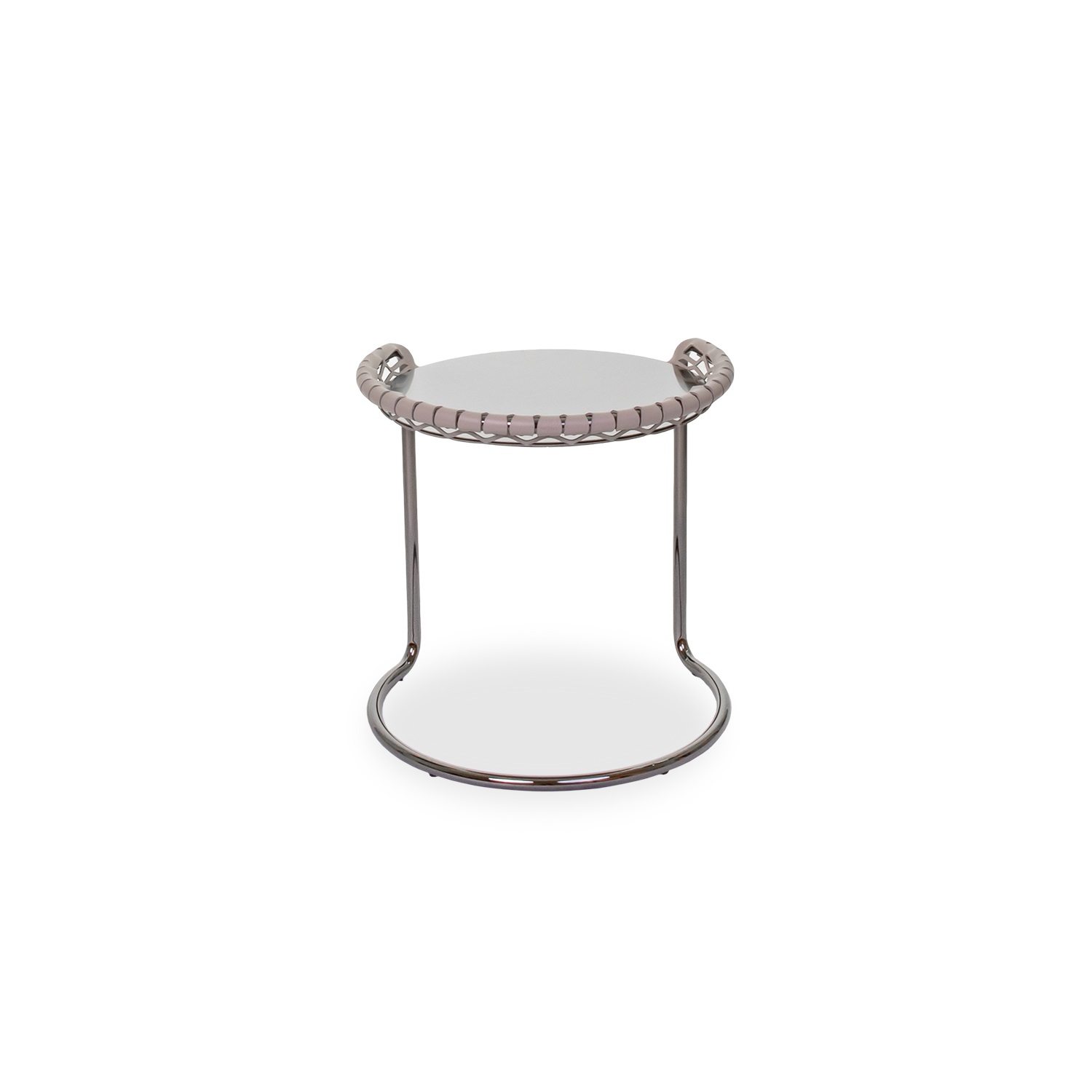 [0] => piva side table 20 round, 20 high black nickel frame dz, tk ash grey hide trim c2gs, satin stainless steel top hs